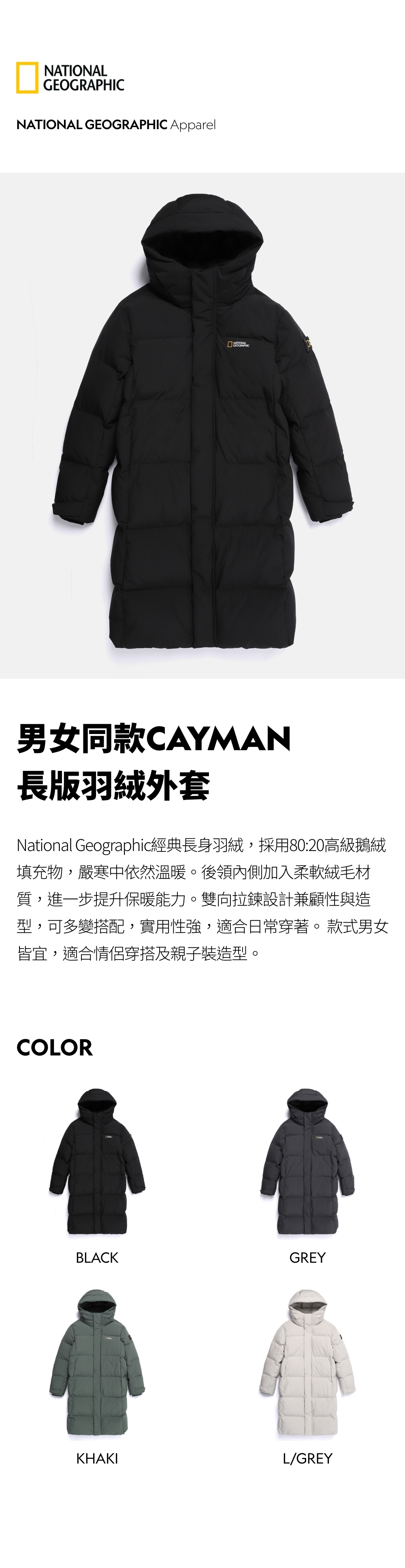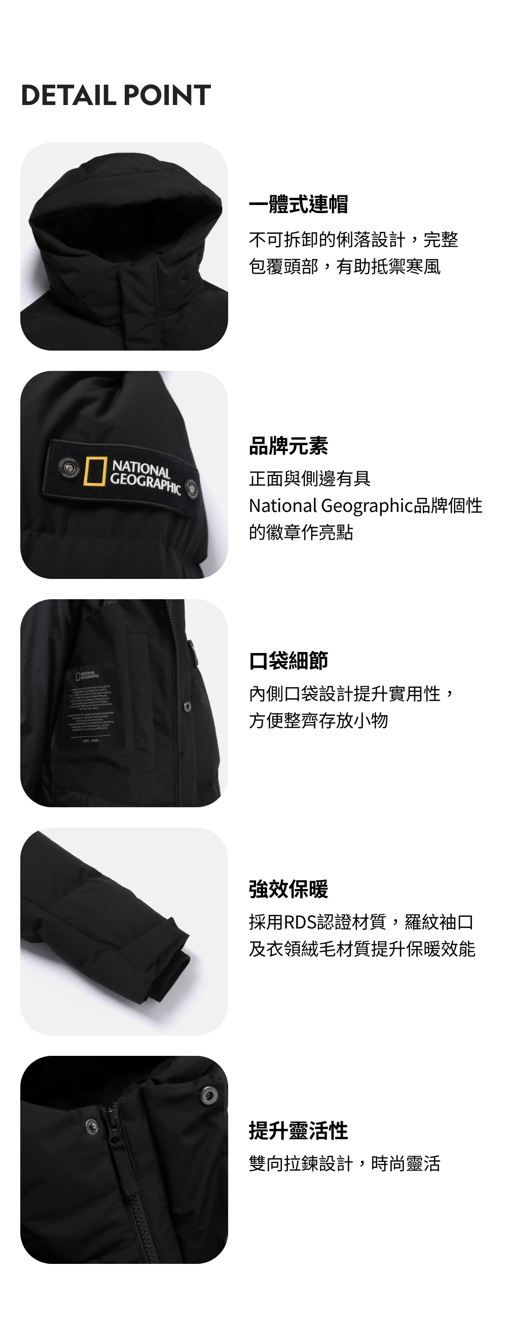 National Geographic經典長身羽絨,採用80:20高級鵝絨填充物,嚴寒中依然溫暖。