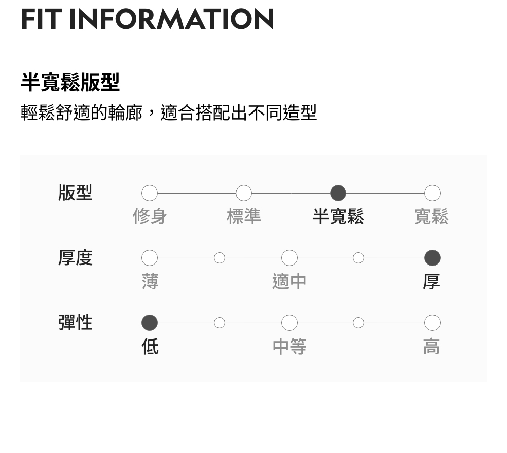 半寬鬆版型 / 厚度:厚 / 彈性:低