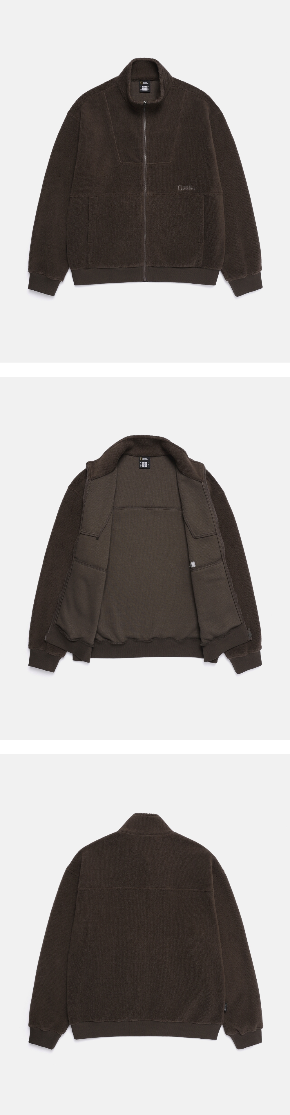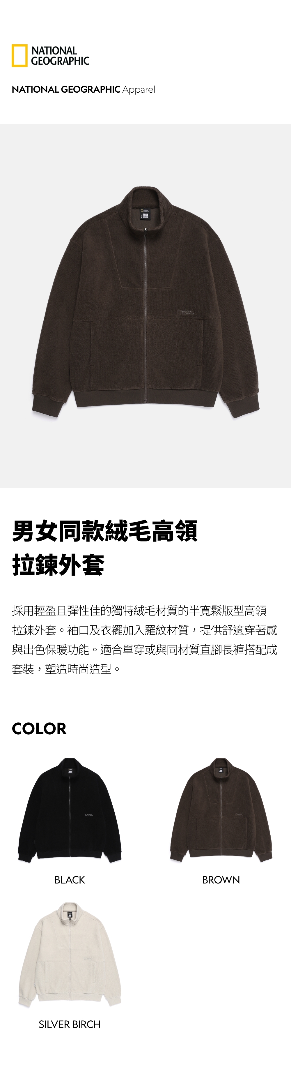採用輕盈且彈性佳的獨特絨毛材質的半寬鬆版型高領拉鍊外套。