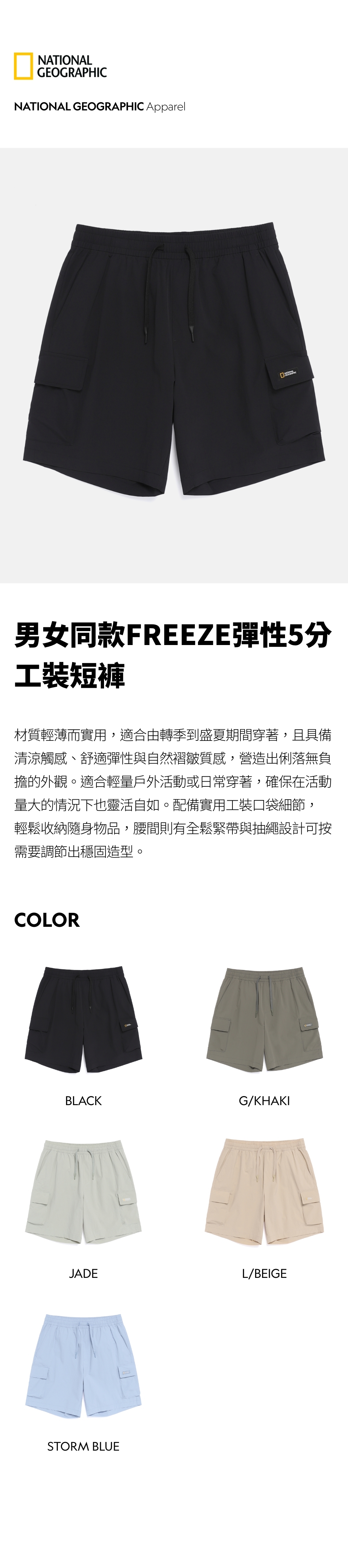 材質輕薄而實用,適合由轉季到盛夏期間穿著,且具備清涼觸感、舒適彈性與自然褶皺質感,營造出俐落無負擔的外觀。適合輕量戶外活動或日常穿著,確保在活動量大的情況下也靈活自如。配備實用工裝口袋細節,輕鬆收納隨身物品,腰間則有全鬆緊帶與抽繩設計可按需要調節出穩固造型。