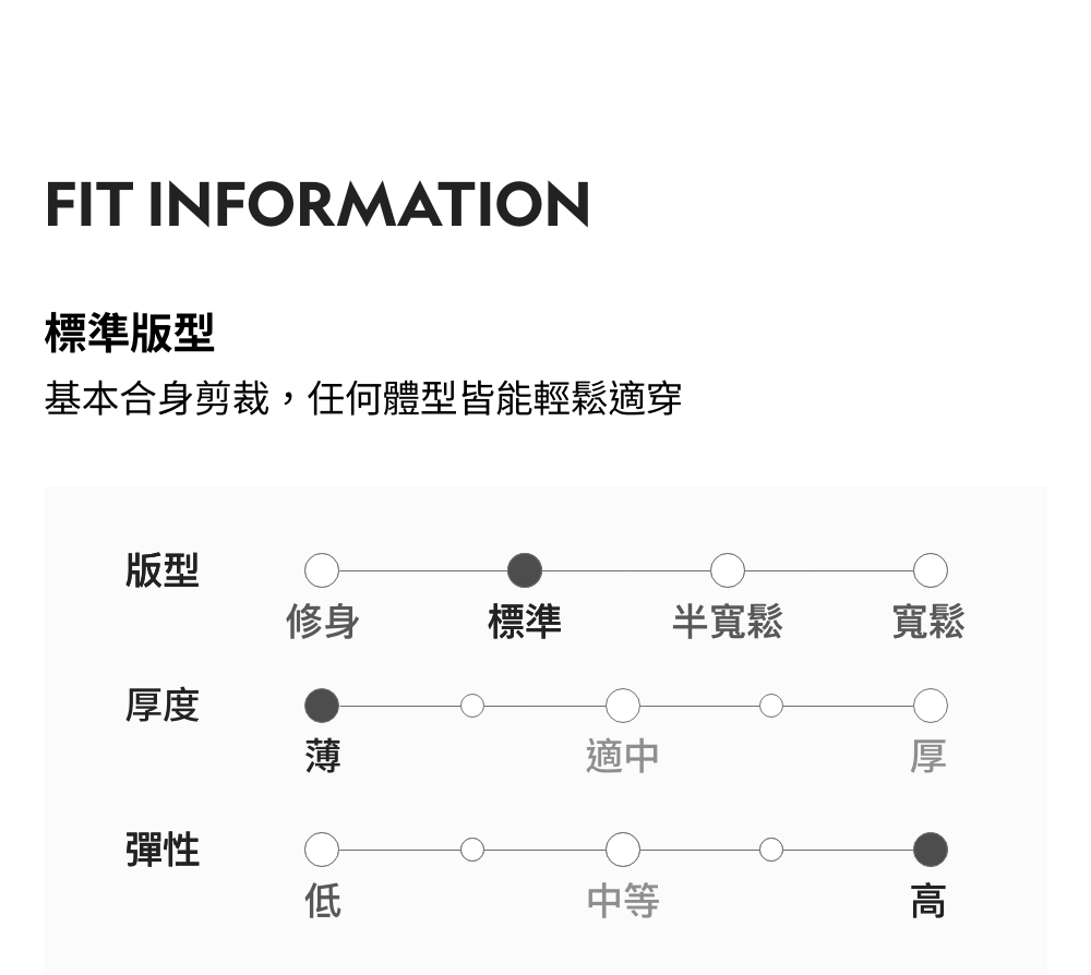 標準版型 / 厚度:薄 / 彈性:高