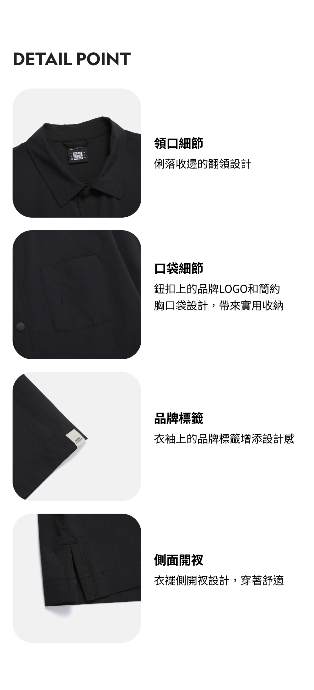 材質輕薄而實用,適合由轉季到盛夏期間穿著,以清涼觸感、高彈性及自然褶皺質感,完成高級外觀。採用有接觸涼感與防曬功能的機能材質,在輕量戶外活動或日常生活中均可維持靈活清爽。前胸綴以單口袋細節,呈現簡約而不單調的設計感。