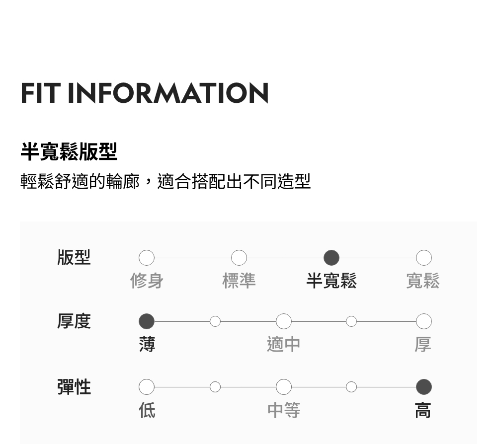 半寬鬆版型 / 厚度:薄 / 彈性:高