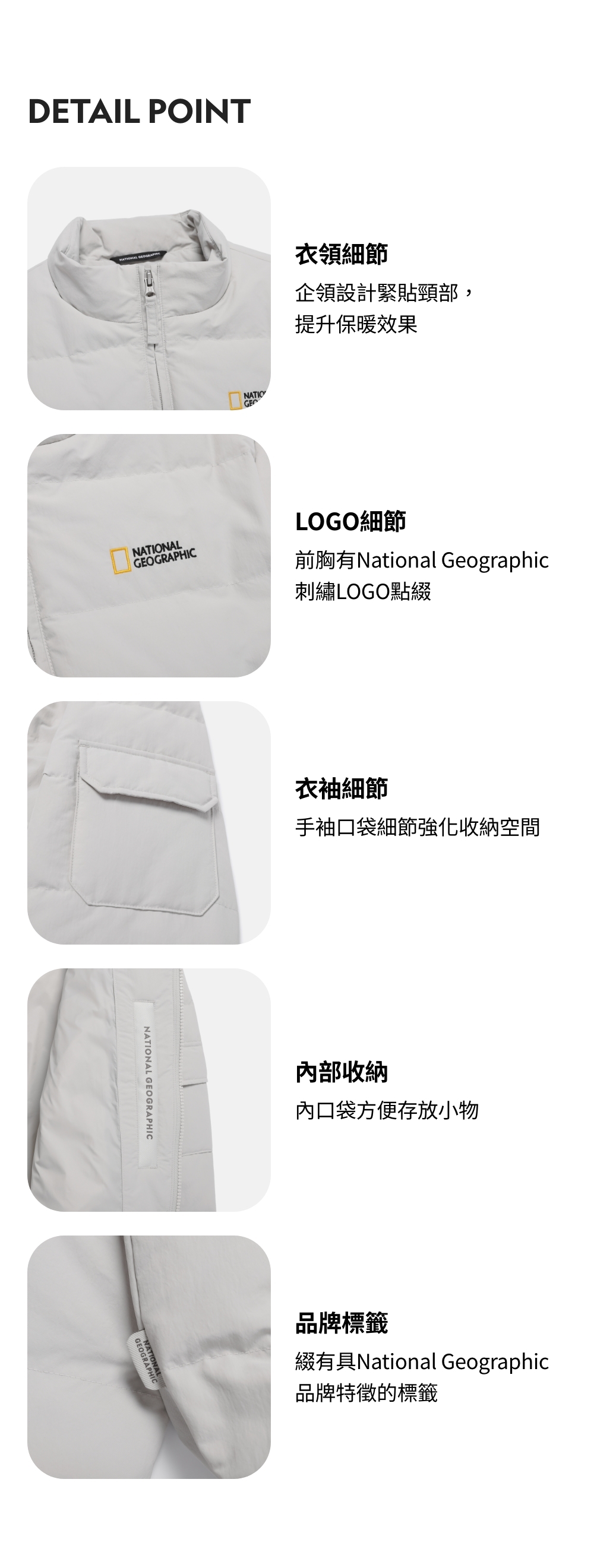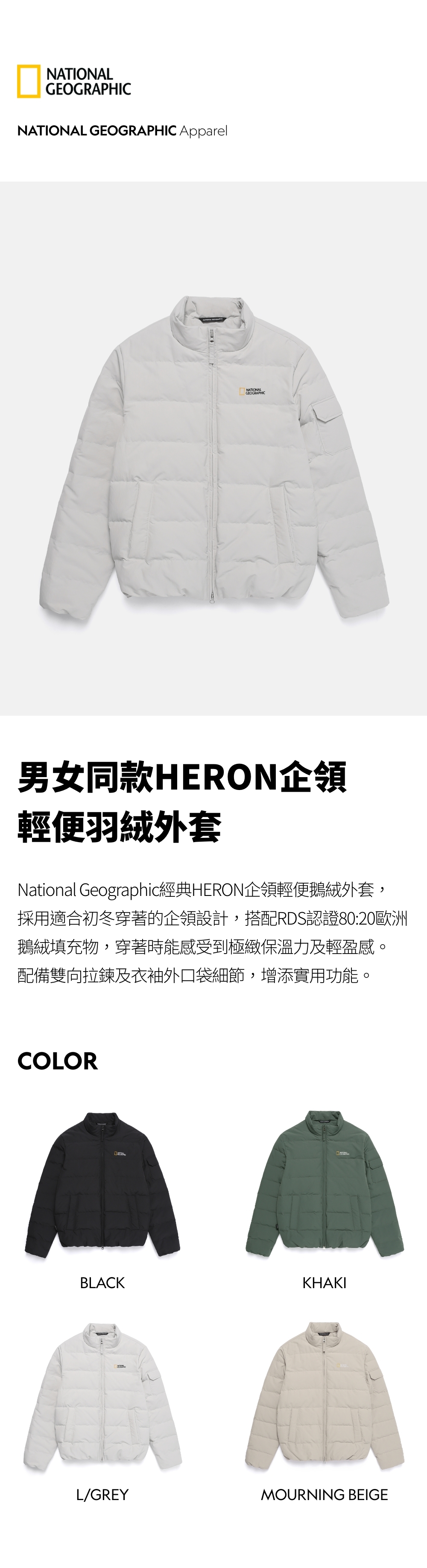 National Geographic經典HERON企領輕便鵝絨外套,採用適合初冬穿著的企領設計,搭配RDS認證80:20歐洲鵝絨填充物,穿著時能感受到極緻保溫力及輕盈感。