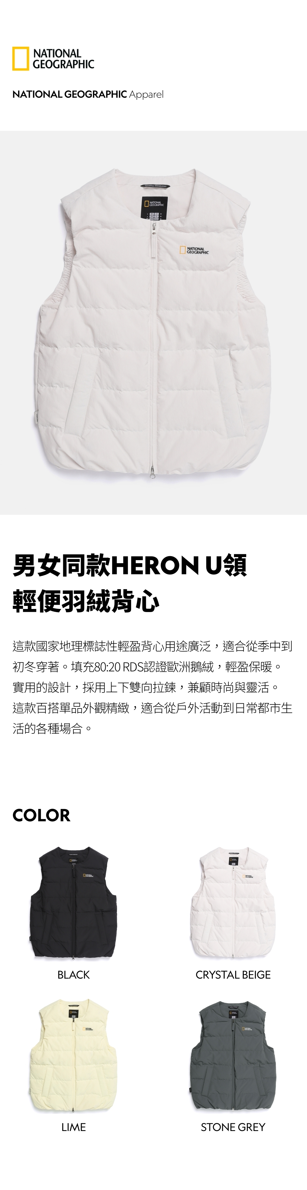 男女同款HERON U領輕便羽絨背心