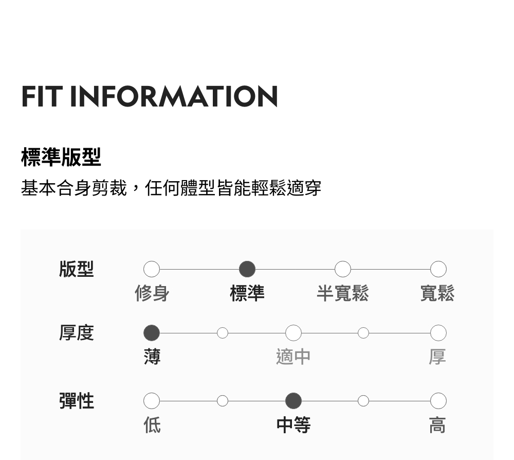 標準版型 / 厚度:薄 / 彈性:中等