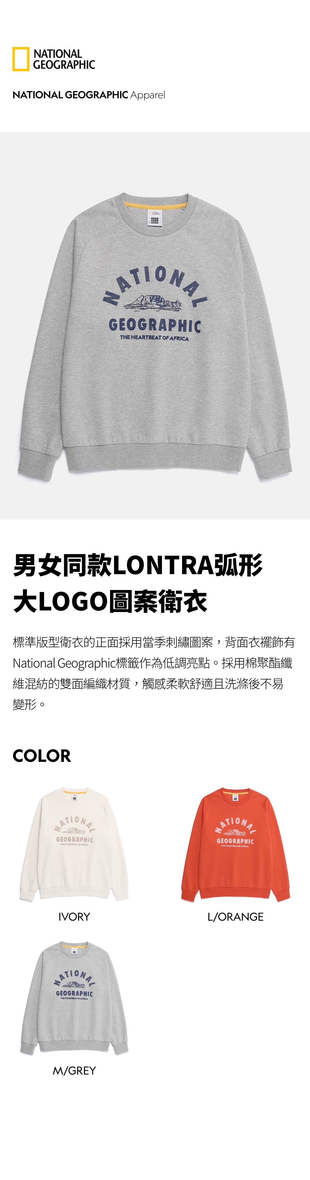 標準版型衛衣的正面採用當季刺繡圖案,背面衣襬飾有National Geographic標籤作為低調亮點。採用棉聚酯纖維混紡的雙面編織材質,觸感柔軟舒適且洗滌後不易變形。