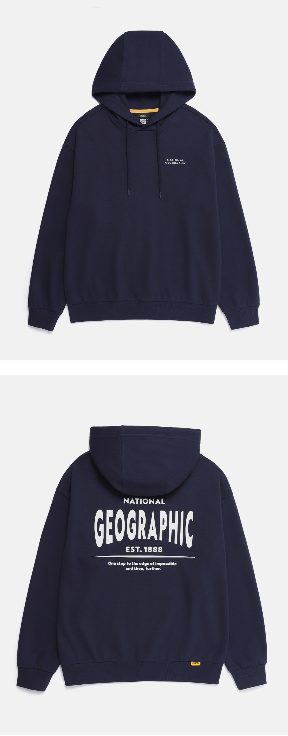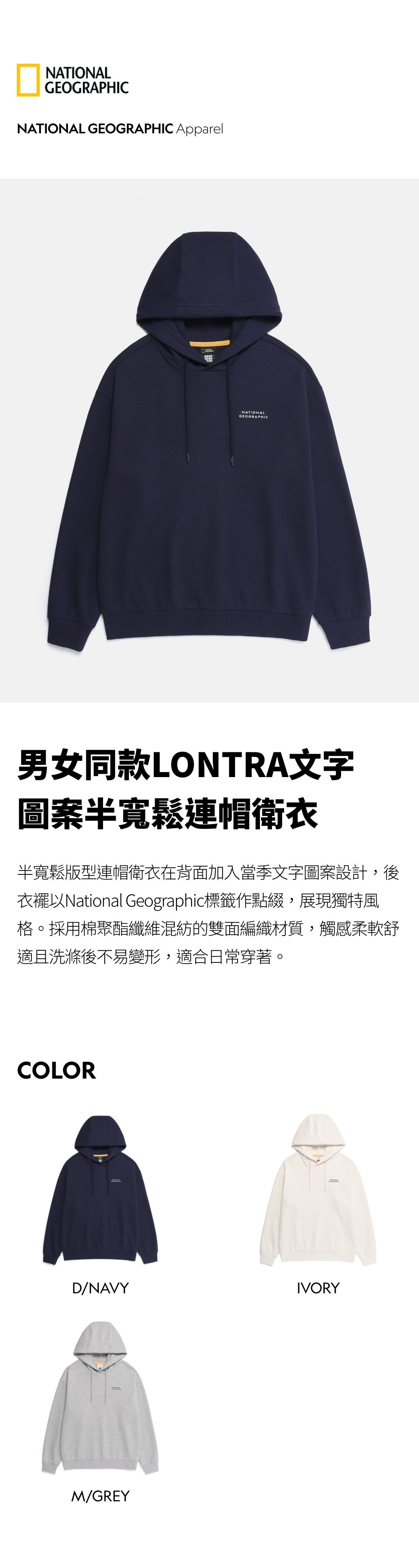 半寬鬆版型連帽衛衣在背面加入當季文字圖案設計,後衣襬以National Geographic標籤作點綴,展現獨特風格。採用棉聚酯纖維混紡的雙面編織材質,觸感柔軟舒適且洗滌後不易變形,適合日常穿著。