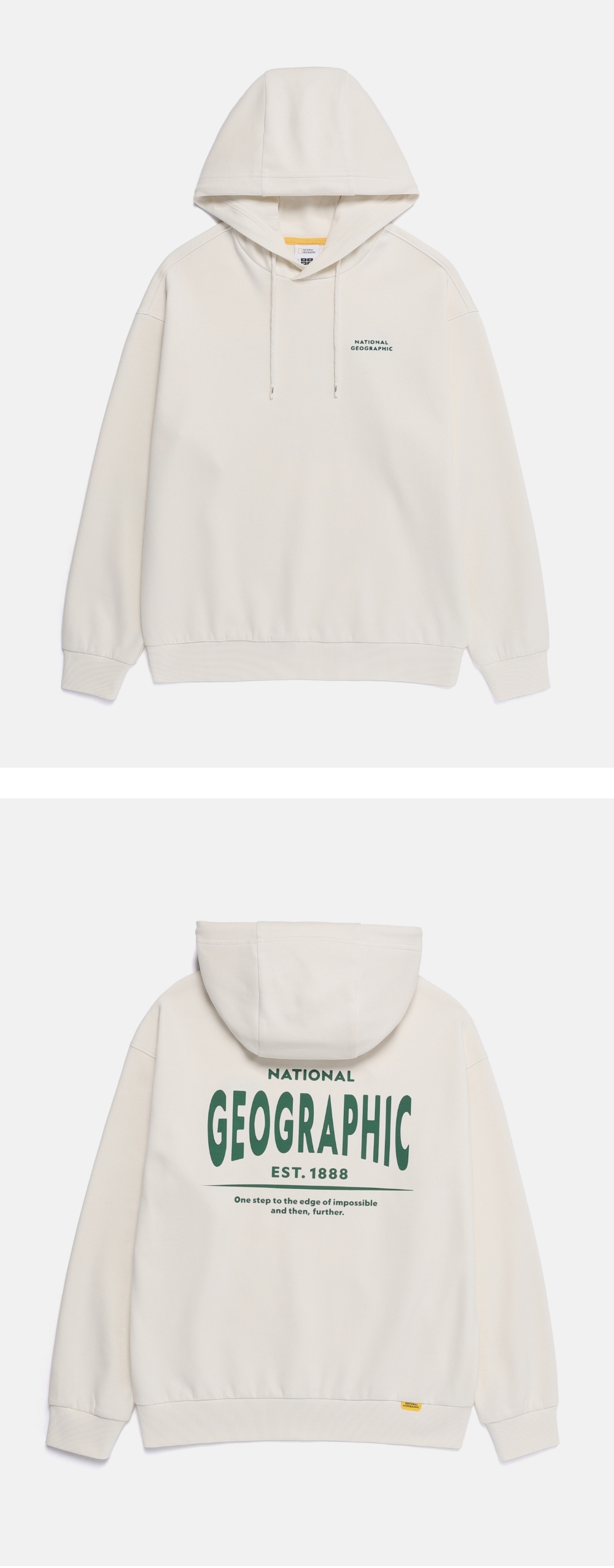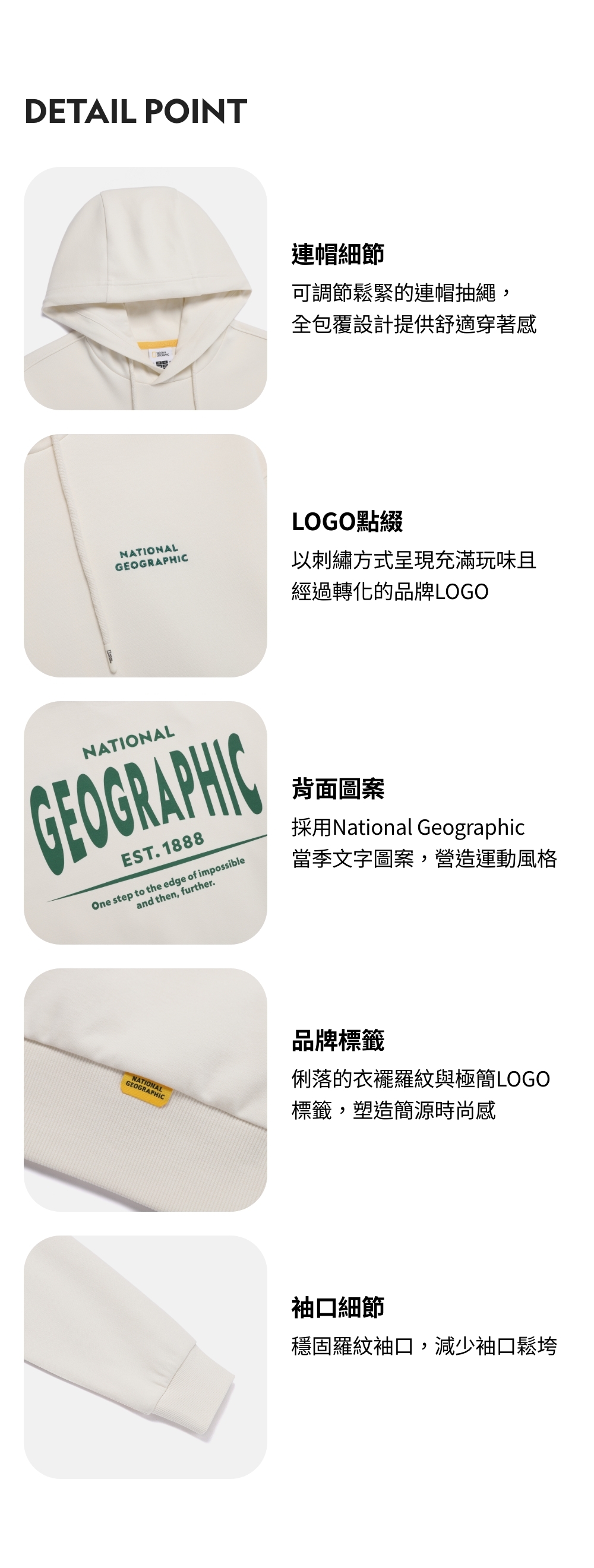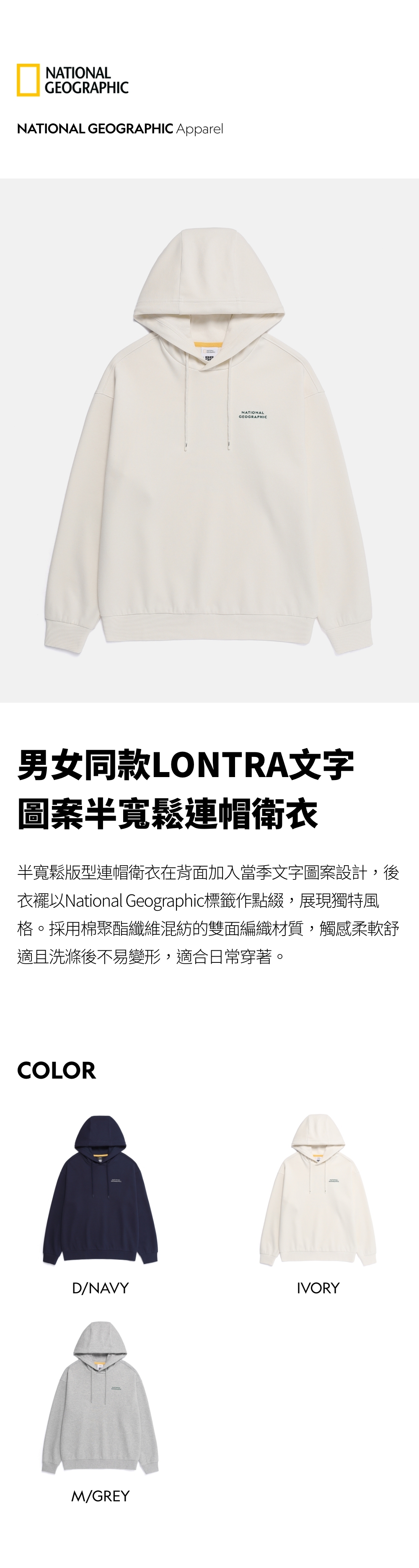 半寬鬆版型連帽衛衣在背面加入當季文字圖案設計,後衣襬以National Geographic標籤作點綴,展現獨特風格。採用棉聚酯纖維混紡的雙面編織材質,觸感柔軟舒適且洗滌後不易變形,適合日常穿著。