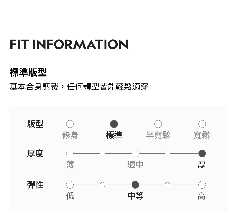 標準版型 / 厚度: 厚 / 彈性 : 中等