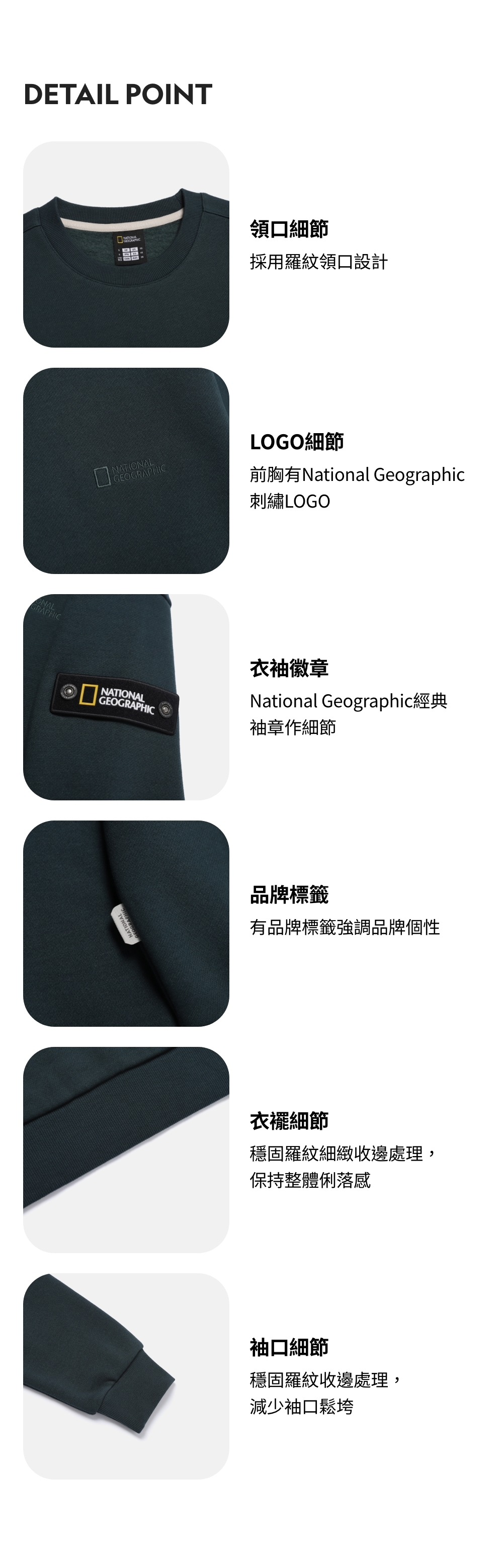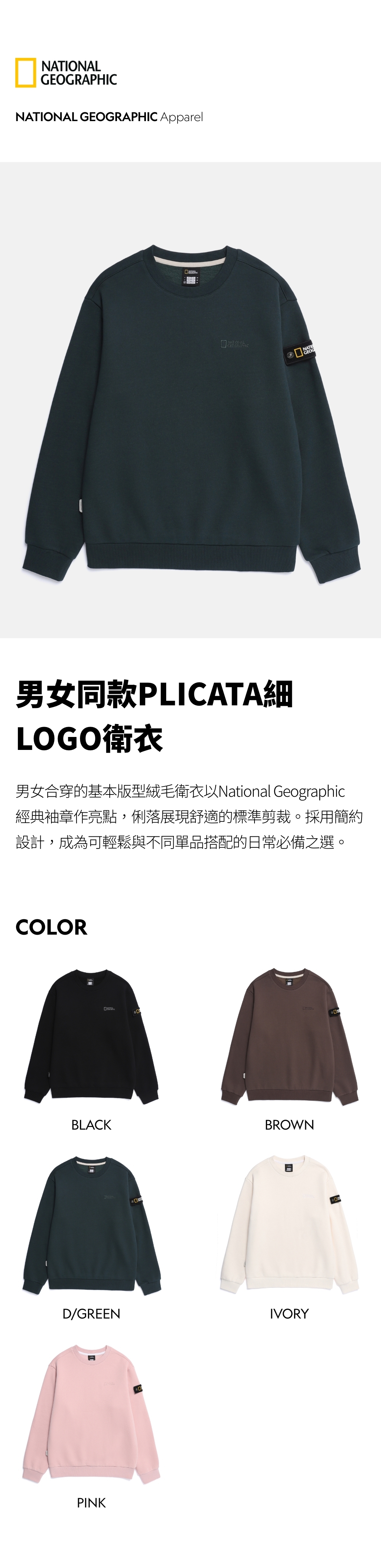 男女合穿的基本版型絨毛衛衣以National Geographic經典袖章作亮點,俐落展現舒適的標準剪裁。