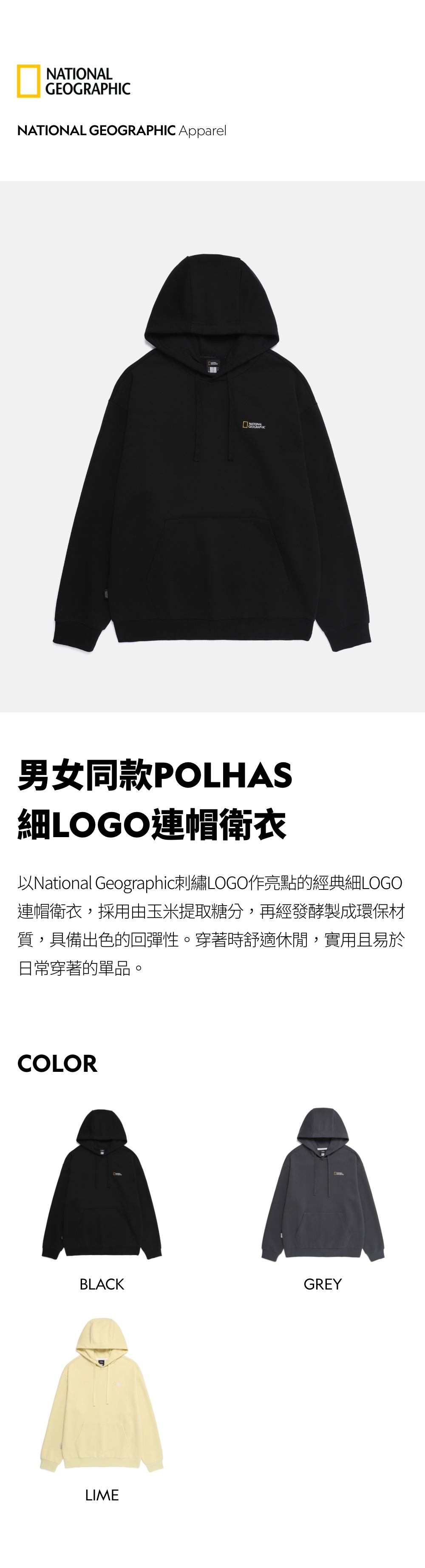 以National Geographic刺繡LOGO作亮點的經典細LOGO連帽衛衣,採用由玉米提取糖分,再經發酵製成環保材質,具備出色的回彈性。