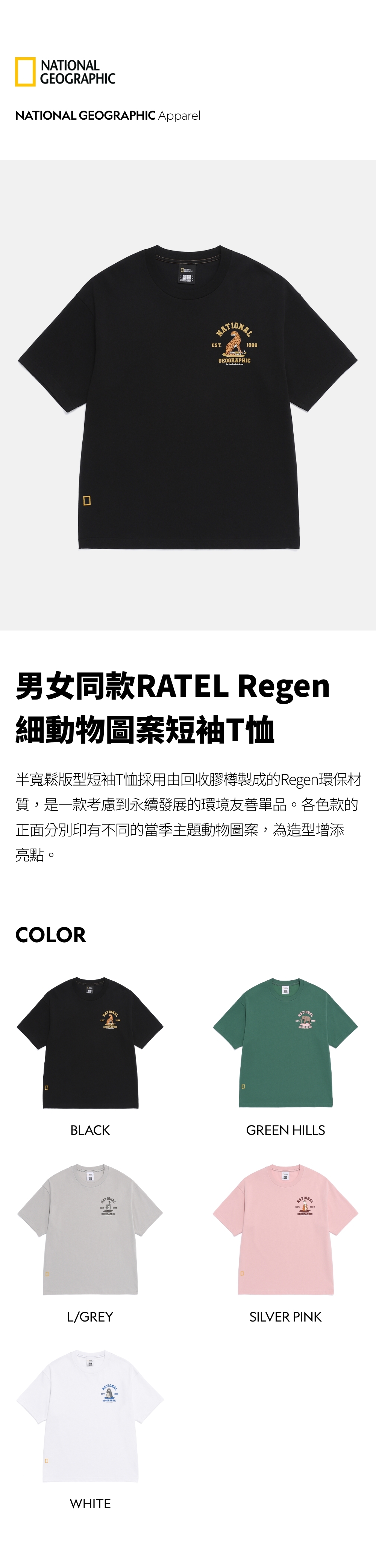 半寬鬆版型短袖T恤採用由回收膠樽製成的Regen環保材質,是一款考慮到永續發展的環境友善單品。各色款的正面分別印有不同的當季主題動物圖案,為造型增添亮點。