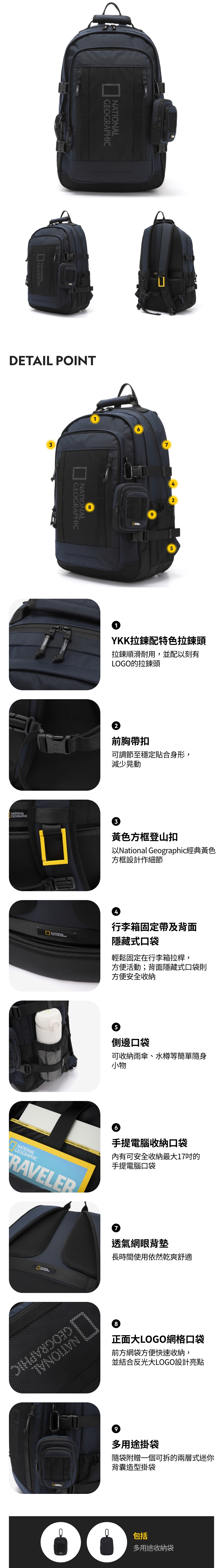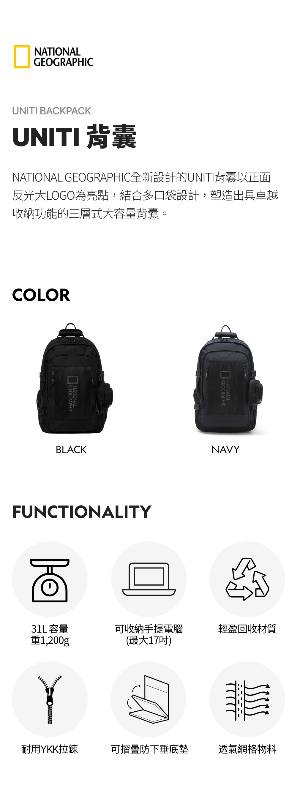 National Geographic全新設計的UNITI背囊以正面反光大LOGO為亮點,結合多口袋設計,塑造出具卓越收納功能的三層式大容量背囊。