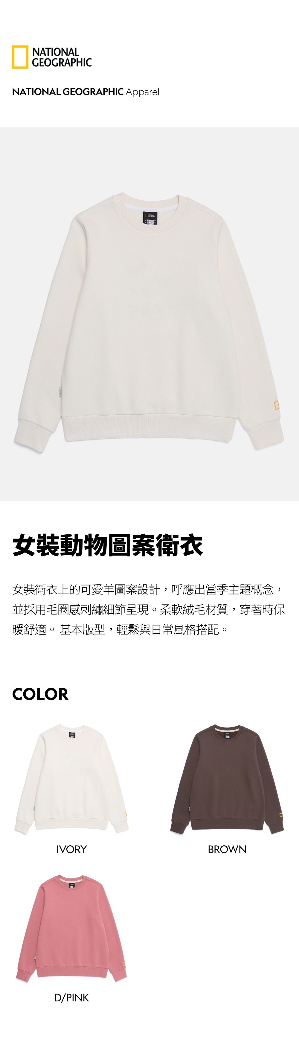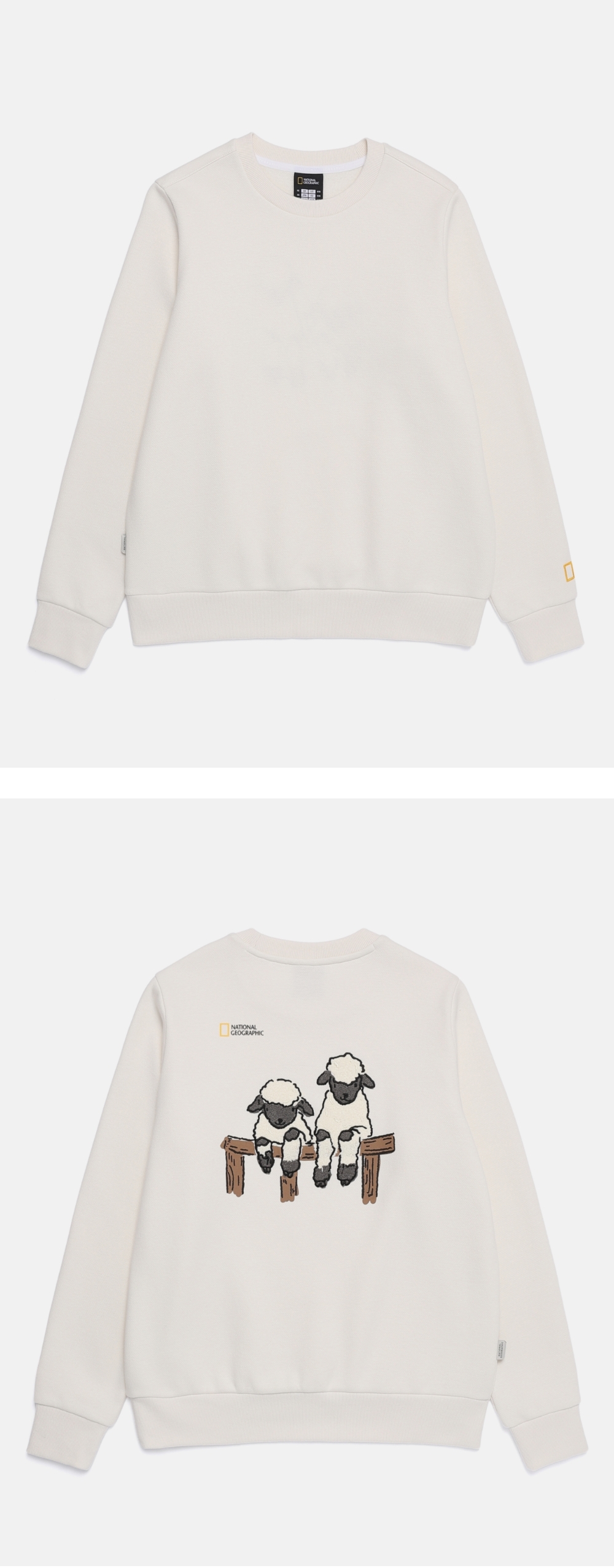 女裝衛衣上的可愛羊圖案設計,呼應出當季主題概念,並採用毛圈感刺繡細節呈現。