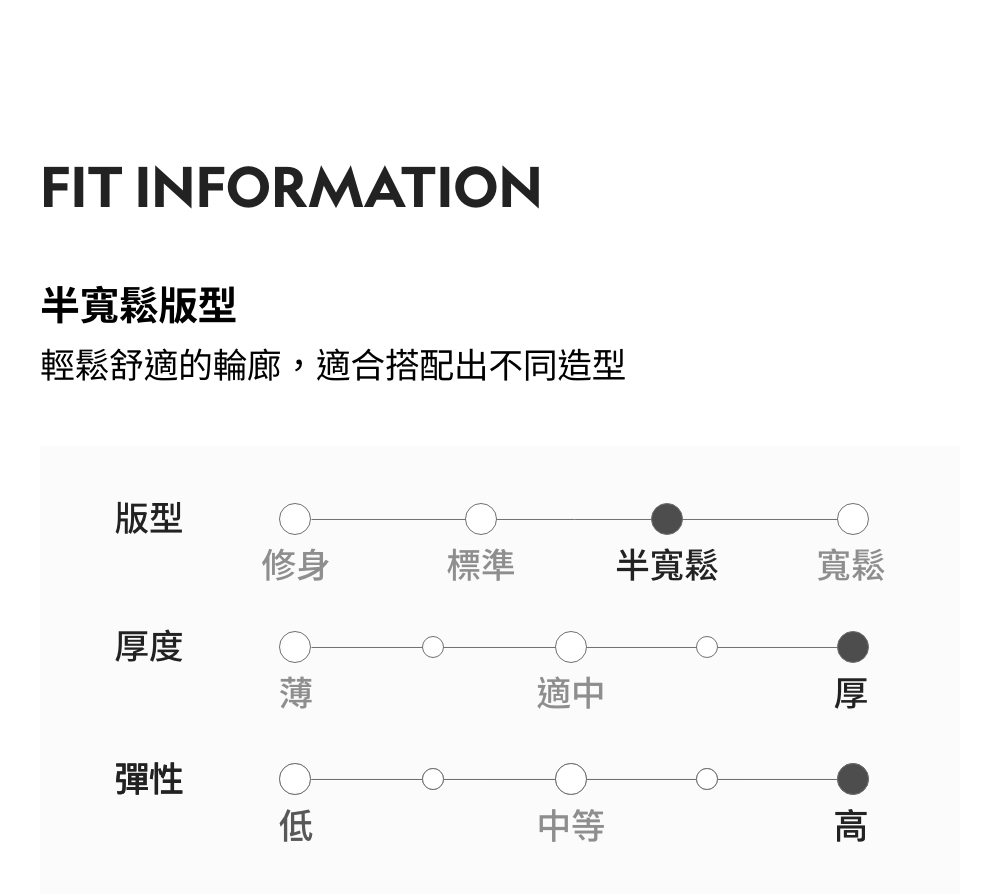半寬鬆版型 / 厚度 : 厚 / 彈性 : 高