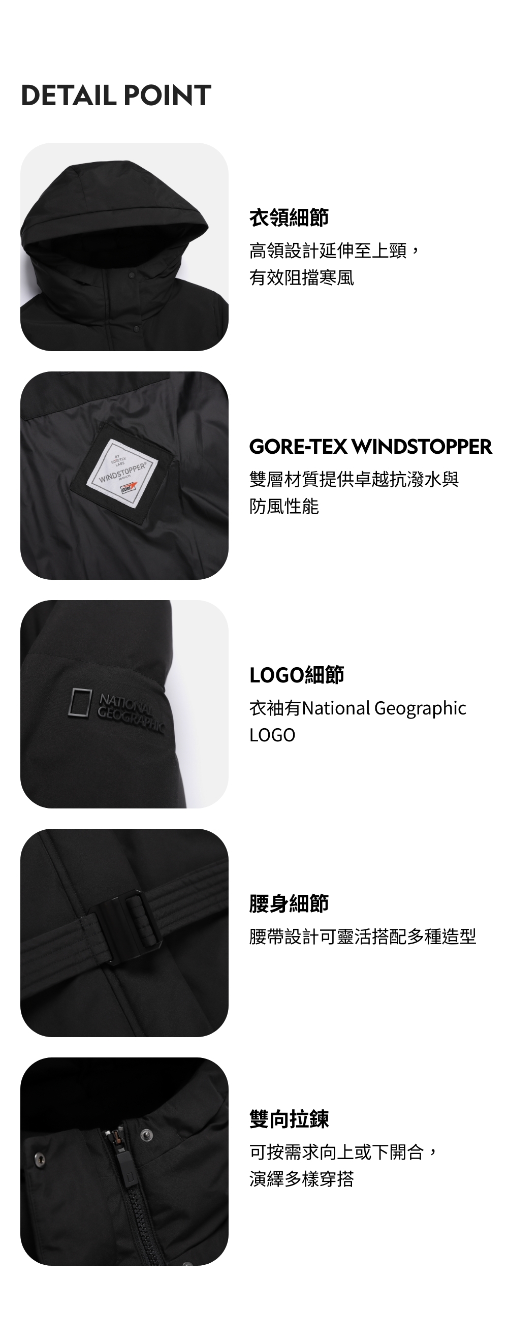 外層選用雙層WINDSTOPPER材質,具備卓越的抗潑水與防風功能,同時透過雅緻光澤突顯高級感。