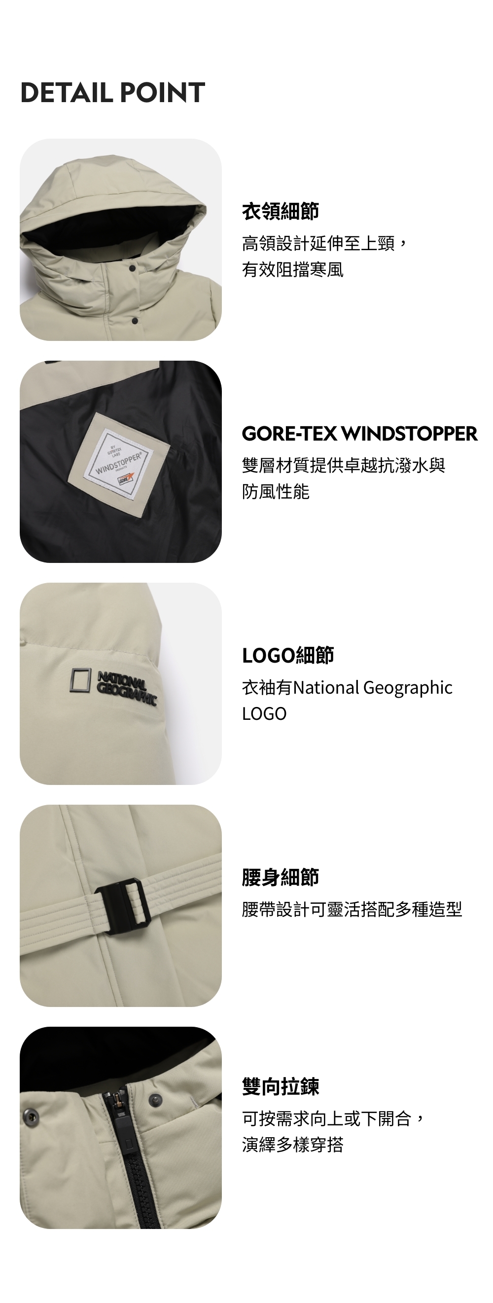 外層選用雙層WINDSTOPPER材質,具備卓越的抗潑水與防風功能,同時透過雅緻光澤突顯高級感。