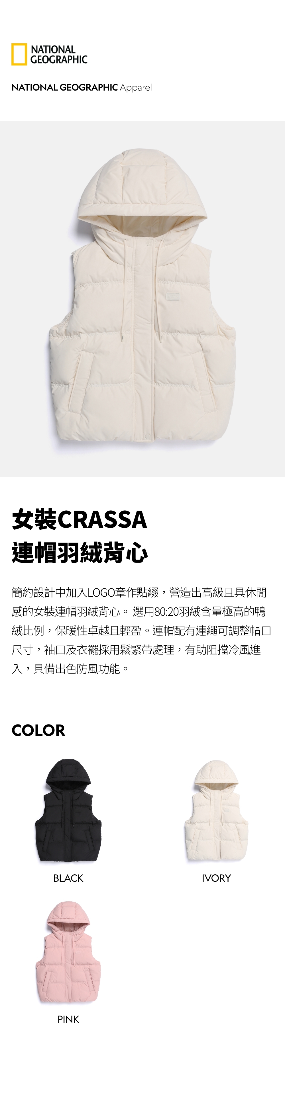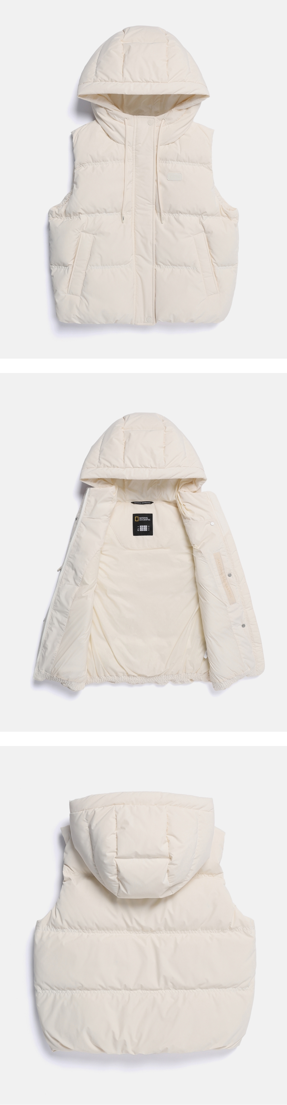 簡約設計中加入LOGO章作點綴,營造出高級且具休閒感的女裝連帽羽絨背心。