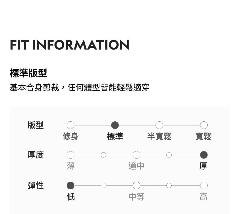 標準版型 / 厚度: 厚 / 彈性 : 低