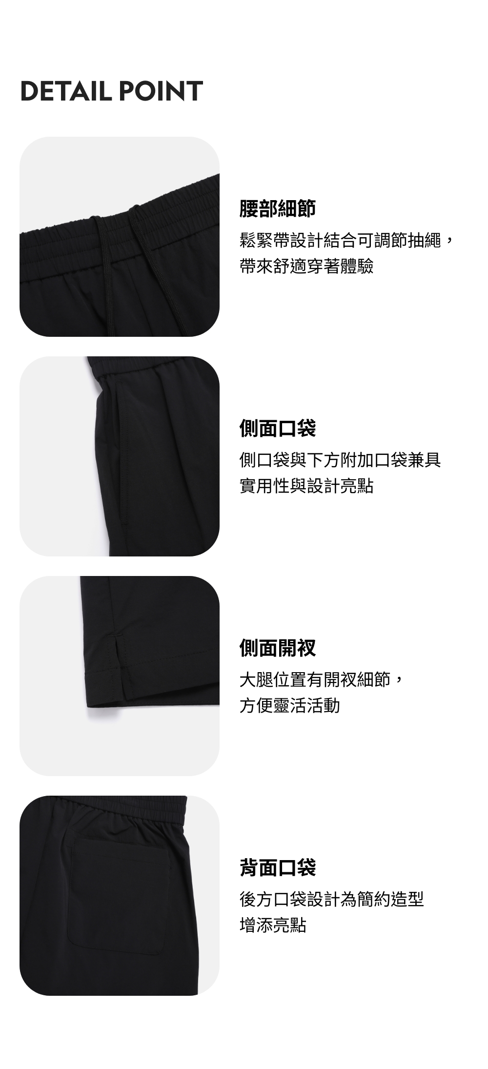 材質輕薄而實用,適合由轉季到盛夏期間穿著,以清涼觸感、高彈性及自然褶皺質感,完成高級外觀。採用有接觸涼感與防曬功能的機能材質,在輕量戶外活動或日常生活中均可維持靈活清爽。腰間有鬆緊帶與抽繩設計,可按需要調整貼合度,側面口袋設計則兼具實用性與設計細節。