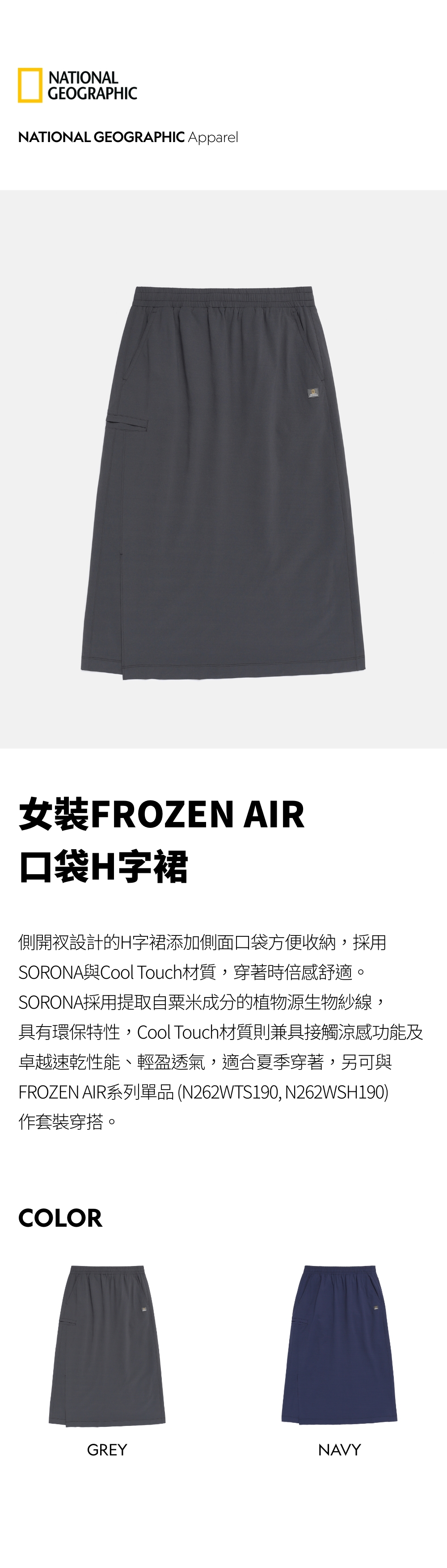 側開衩設計的H字裙添加側面口袋方便收納,採用SORONA與Cool Touch材質,穿著時倍感舒適。SORONA採用提取自粟米成分的植物源生物紗線,具有環保特性,Cool Touch材質則兼具接觸涼感功能及卓越速乾性能、輕盈透氣,適合夏季穿著,另可與FROZEN AIR系列單品 (N262WTS190, N262WSH190) 作套裝穿搭。
