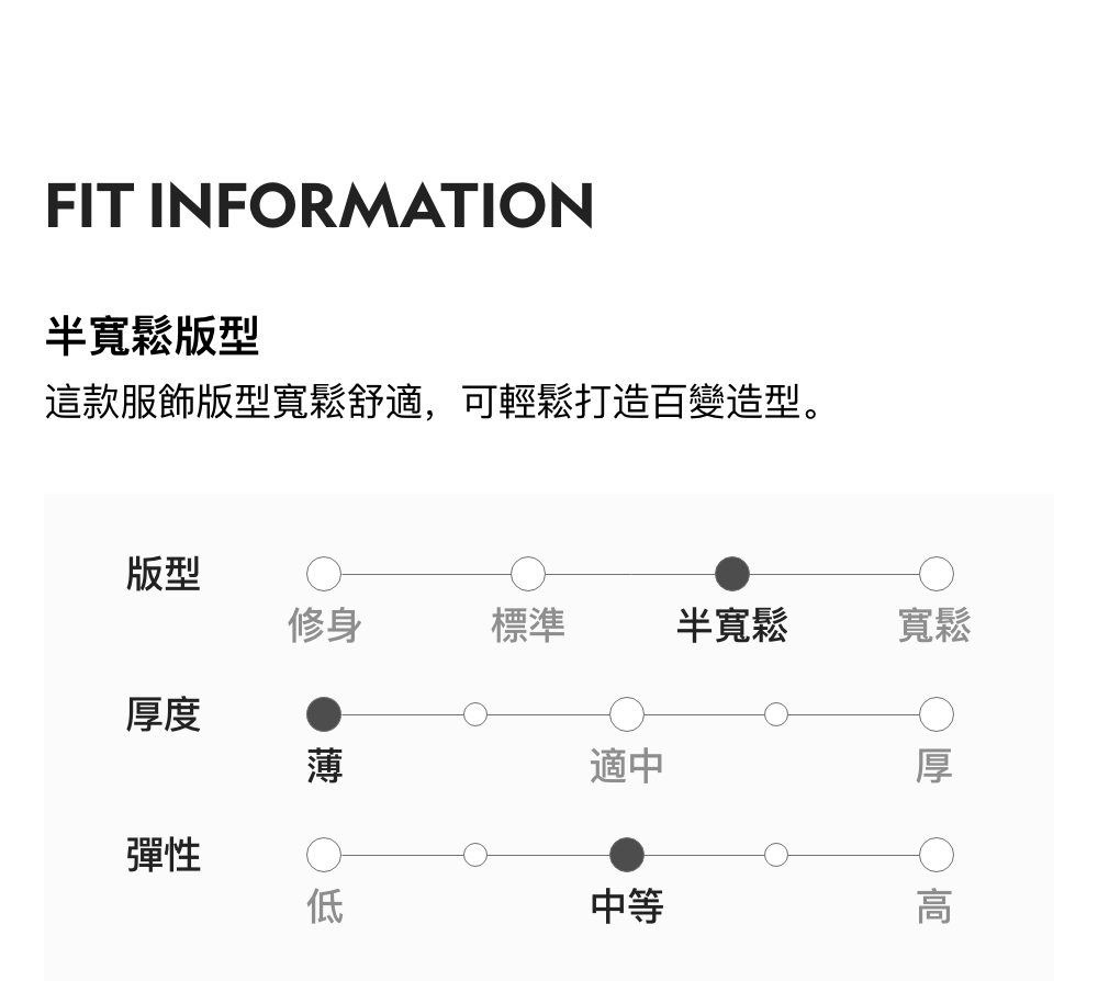 半寬鬆版型 / 厚度:薄 / 彈性:中等