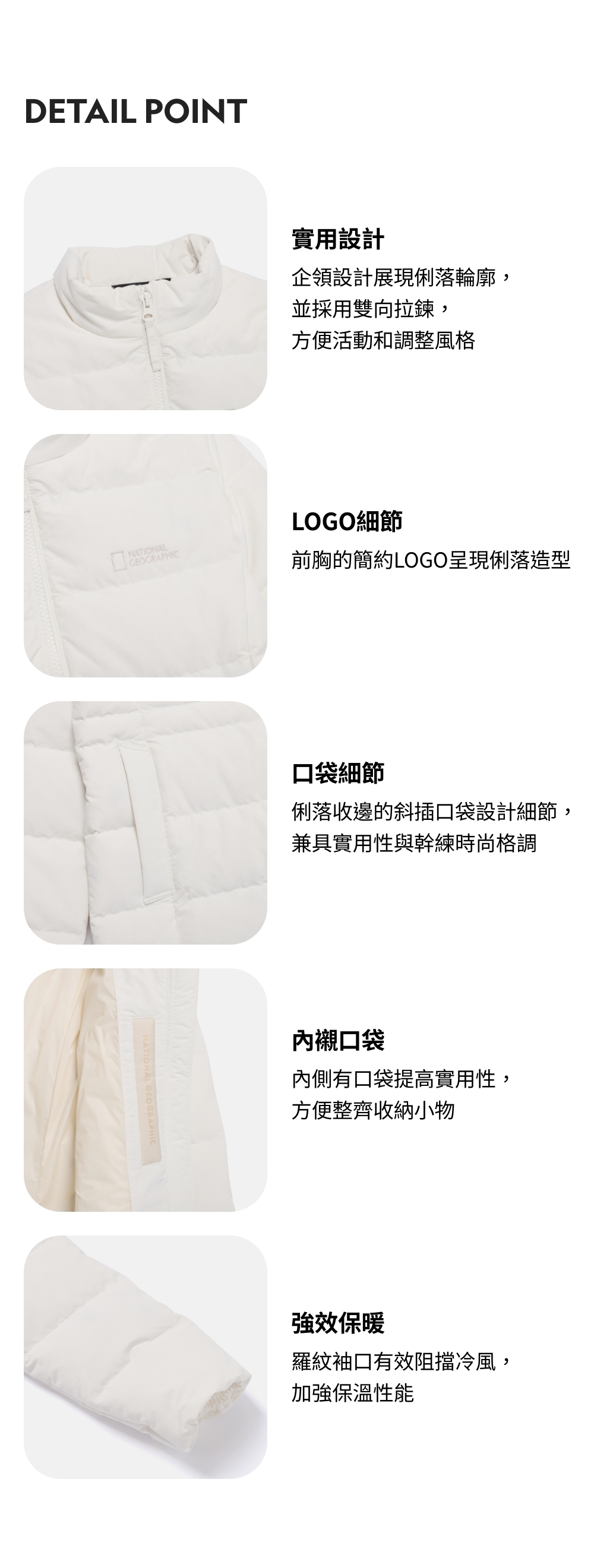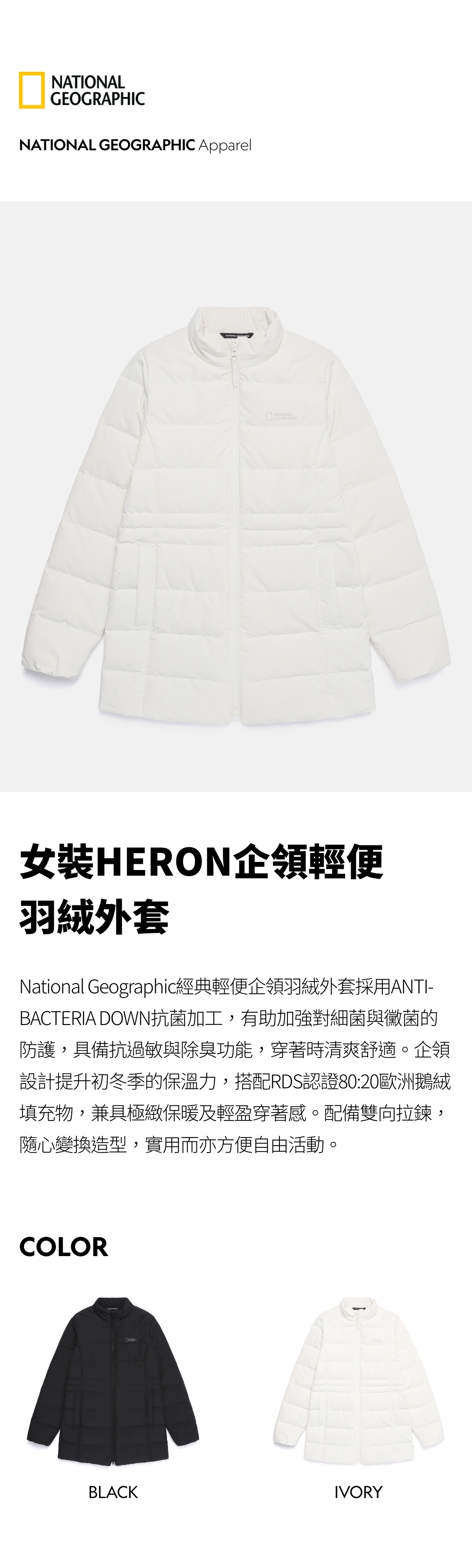 National Geographic經典輕便企領羽絨外套採用ANTI-BACTERIA DOWN抗菌加工,有助加強對細菌與黴菌的防護,具備抗過敏與除臭功能,穿著時清爽舒適。