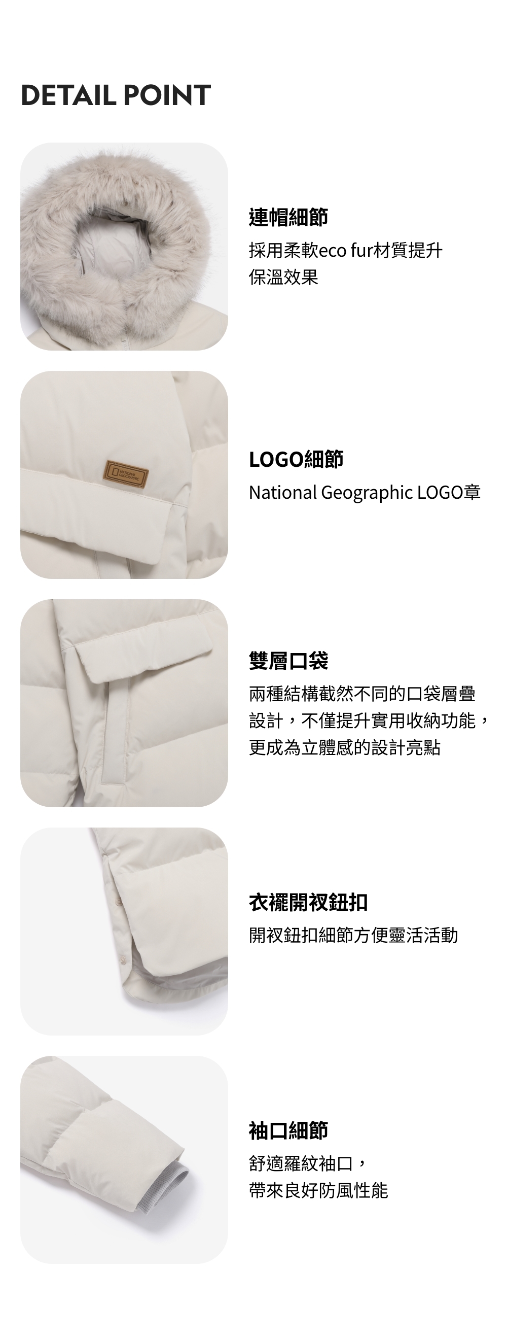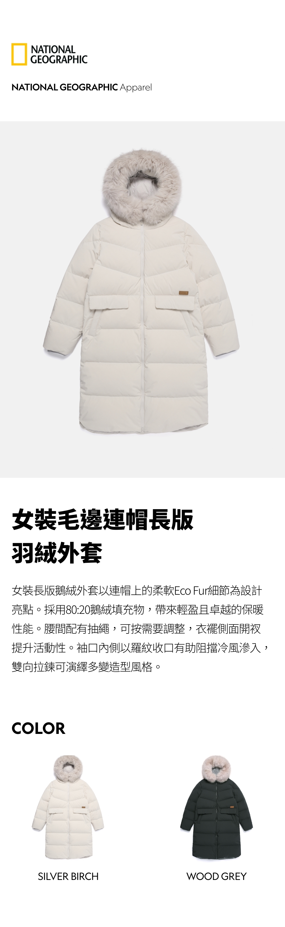 女裝長版鵝絨外套以連帽上的柔軟Eco Fur細節為設計亮點。
