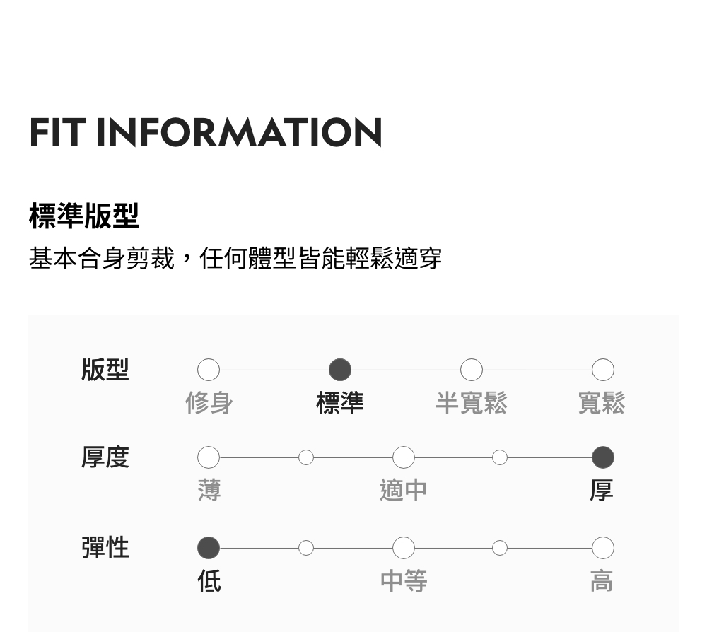 標準版型 / 厚度: 厚 / 彈性 : 低