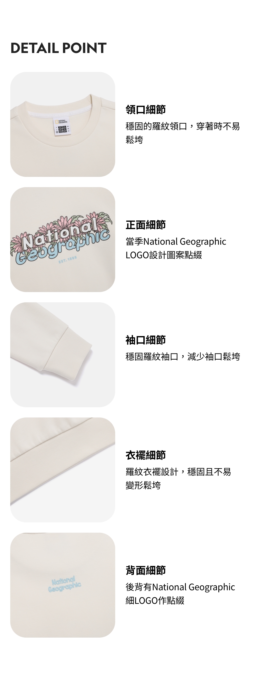穩固的羅紋領口,穿著時不易鬆垮