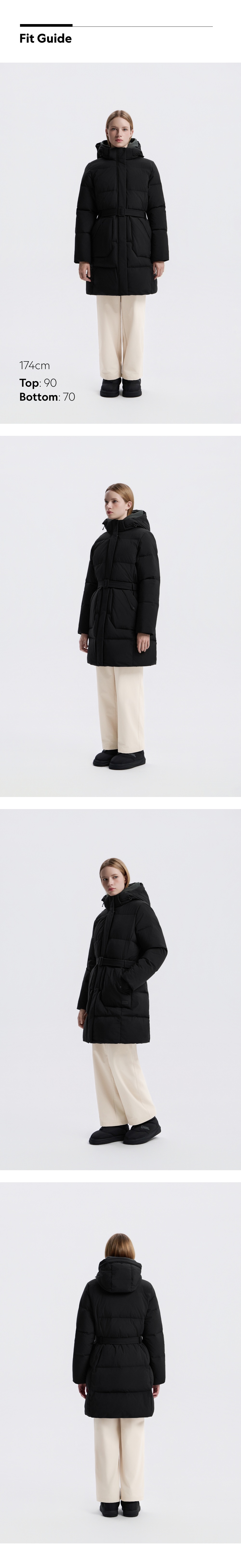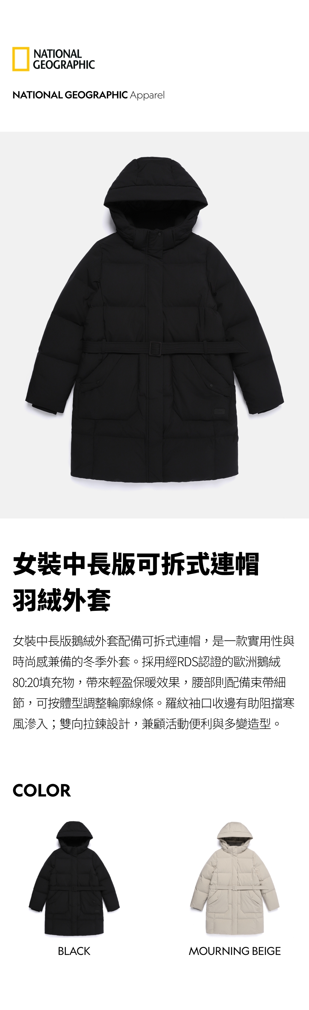 女裝中長版鵝絨外套配備可拆式連帽,是一款實用性與時尚感兼備的冬季外套。