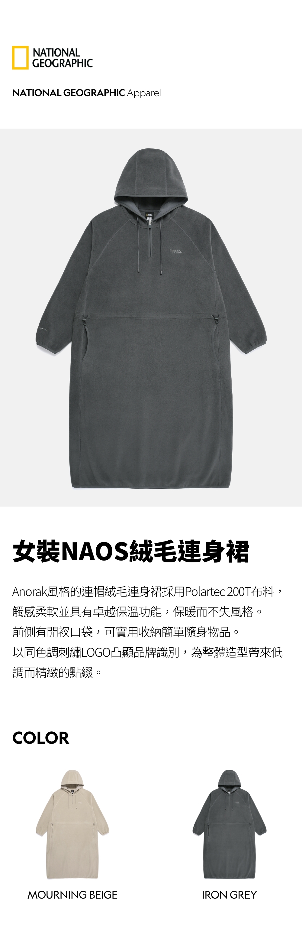 Anorak風格的連帽絨毛連身裙採用Polartec 200T布料,觸感柔軟並具有卓越保溫功能,保暖而不失風格。