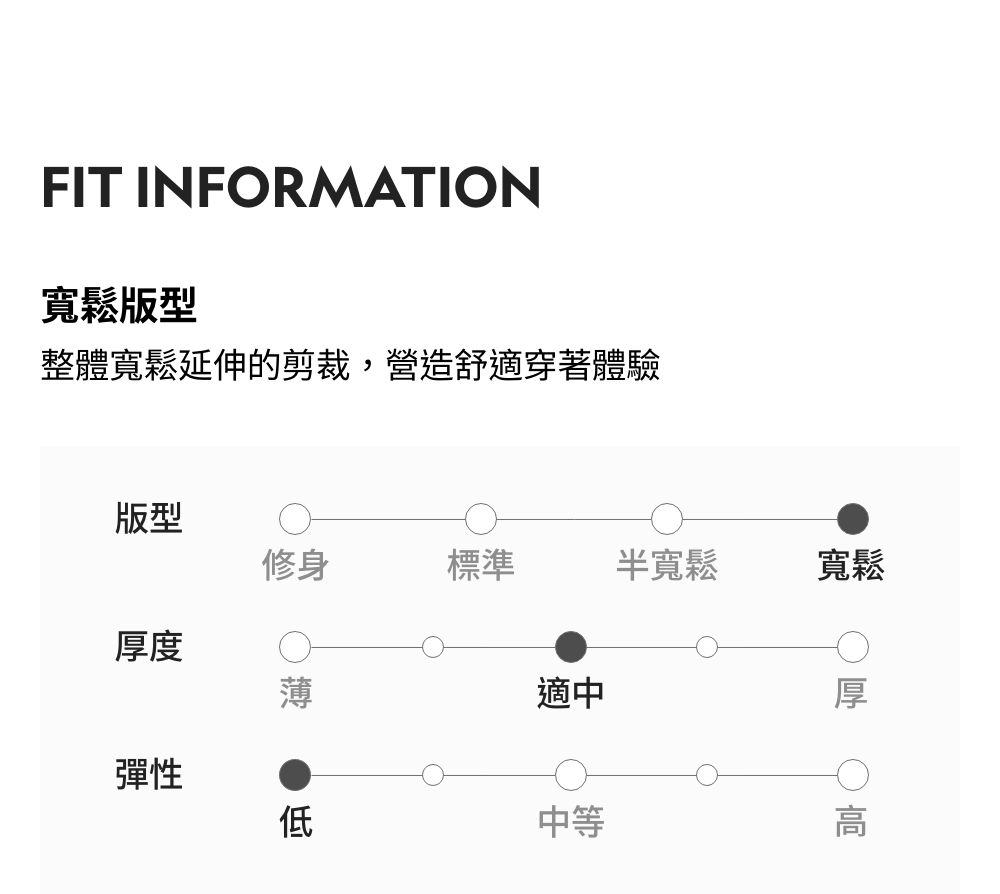 寬鬆版型 / 厚度: 適中 / 彈性 : 低