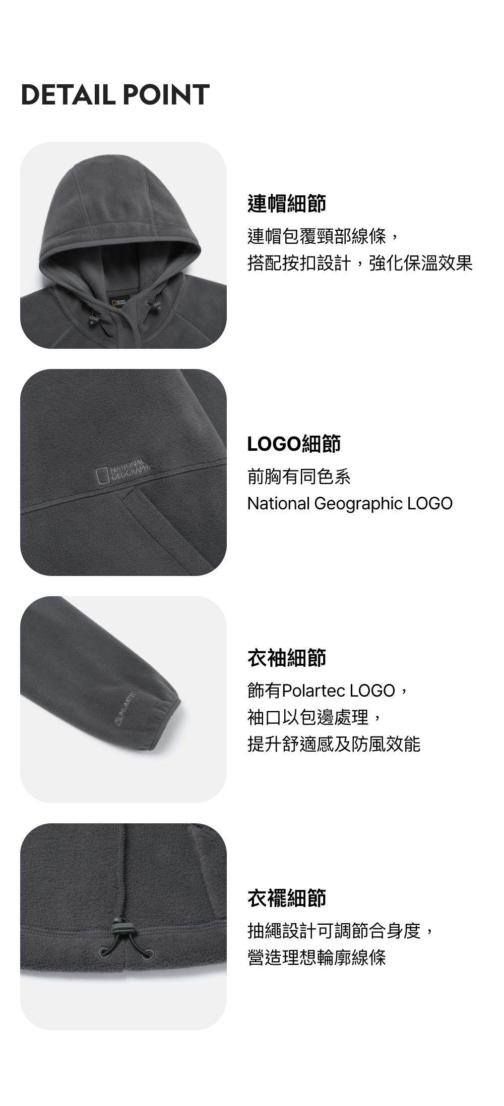 連帽包覆頸部線條,搭配按扣設計,強化保溫效果