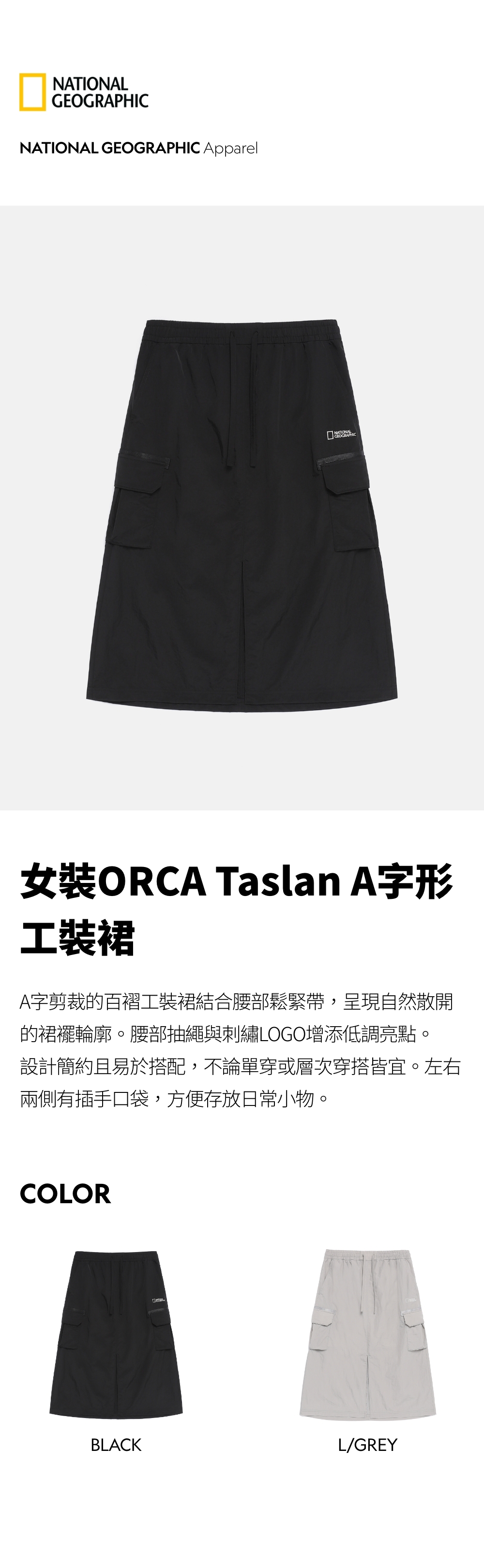 A字剪裁的百褶工裝裙結合腰部鬆緊帶,呈現自然散開的裙襬輪廓。腰部抽繩與刺繡LOGO增添低調亮點。設計簡約且易於搭配,不論單穿或層次穿搭皆宜。左右兩側有插手口袋,方便存放日常小物。