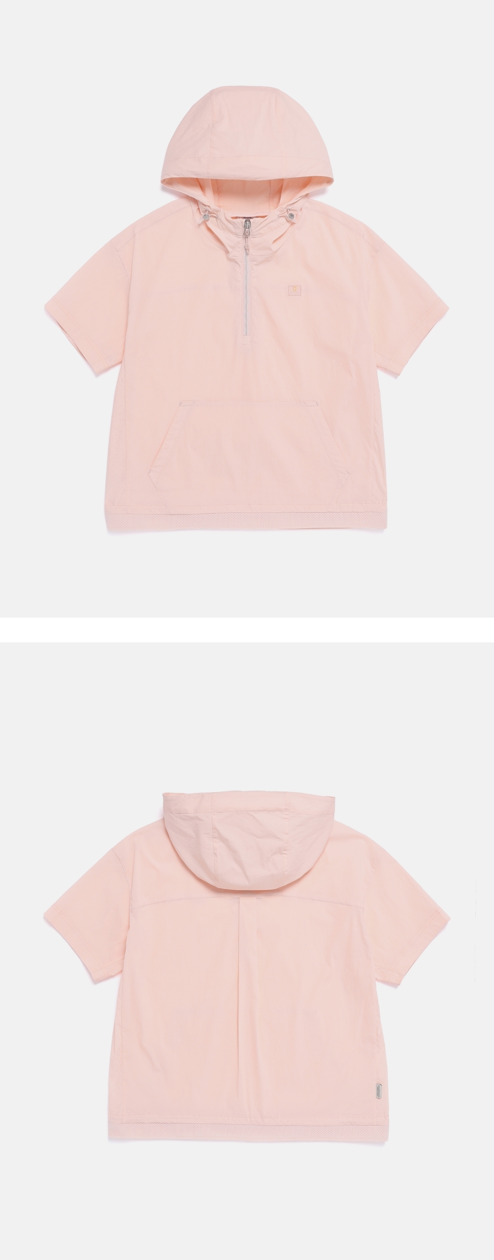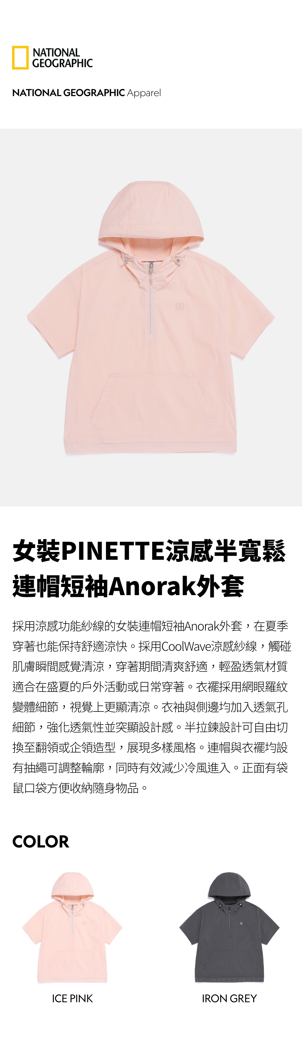 採用涼感功能紗線的女裝連帽短袖Anorak外套,在夏季穿著也能保持舒適涼快。採用CoolWave涼感紗線,觸碰肌膚瞬間感覺清涼,穿著期間清爽舒適,輕盈透氣材質適合在盛夏的戶外活動或日常穿著。衣襬採用網眼羅紋變體細節,視覺上更顯清涼。衣袖與側邊均加入透氣孔細節,強化透氣性並突顯設計感。半拉鍊設計可自由切換至翻領或企領造型,展現多樣風格。連帽與衣襬均設有抽繩可調整輪廓,同時有效減少冷風進入。正面有袋鼠口袋方便收納隨身物品。