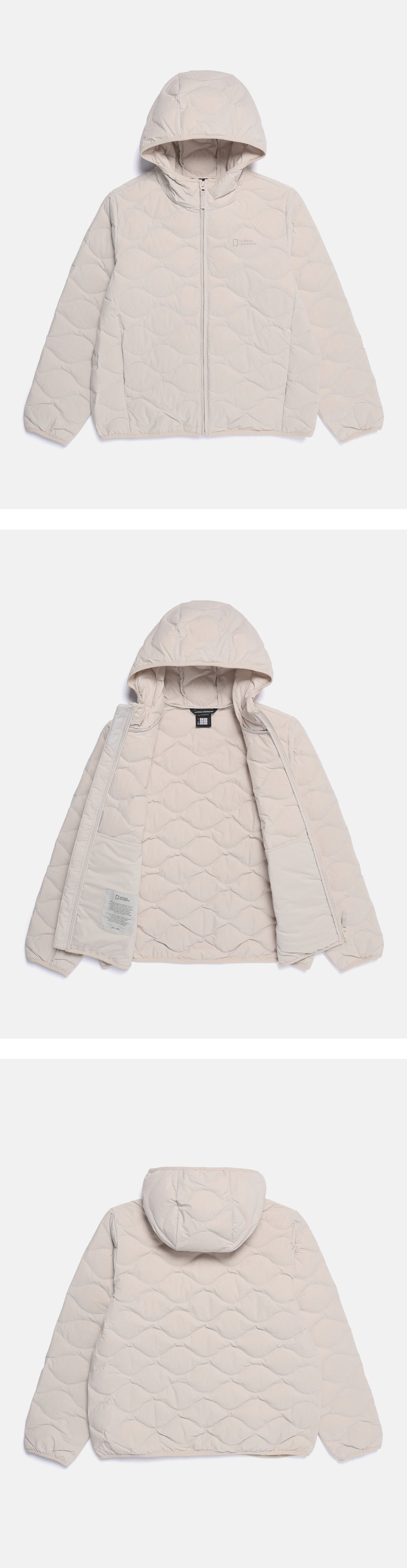 採用鴨絨填充物的管狀布料連帽羽絨外套,採用波浪紋絎縫細節,為基本設計注入精緻亮點。