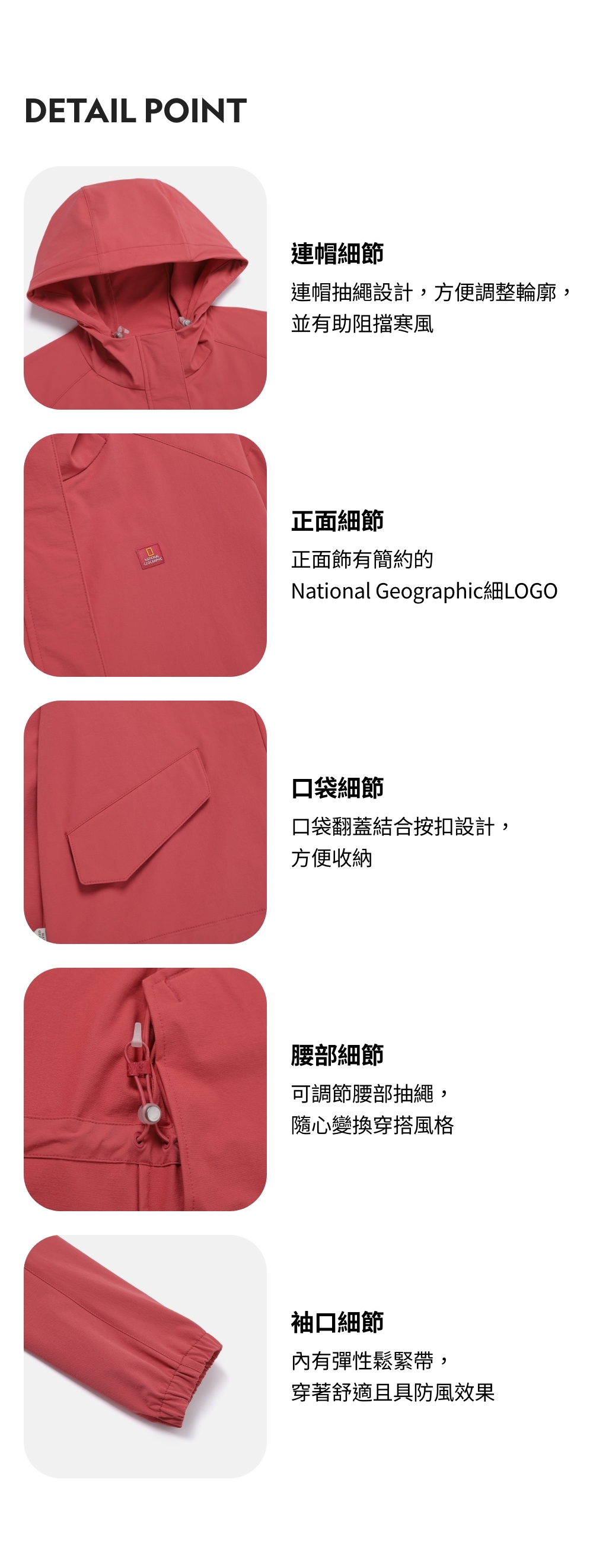 內有彈性鬆緊帶,穿著舒適且具防風效果