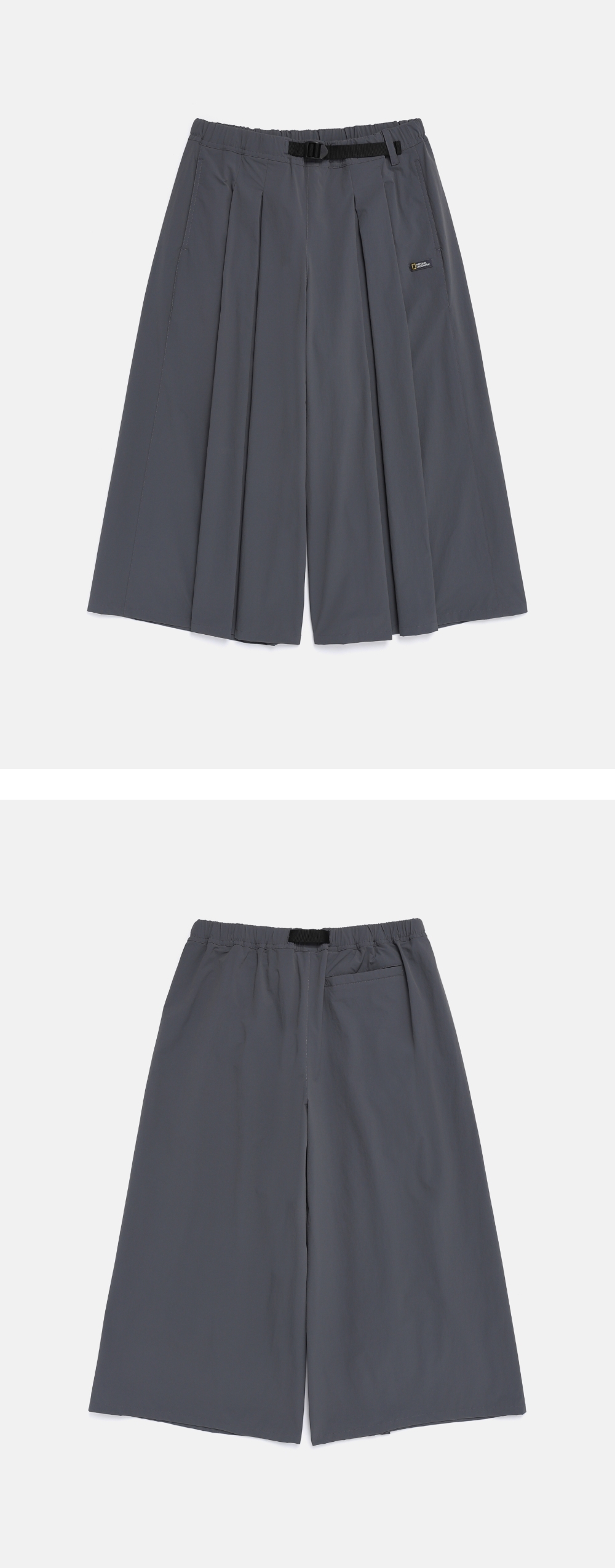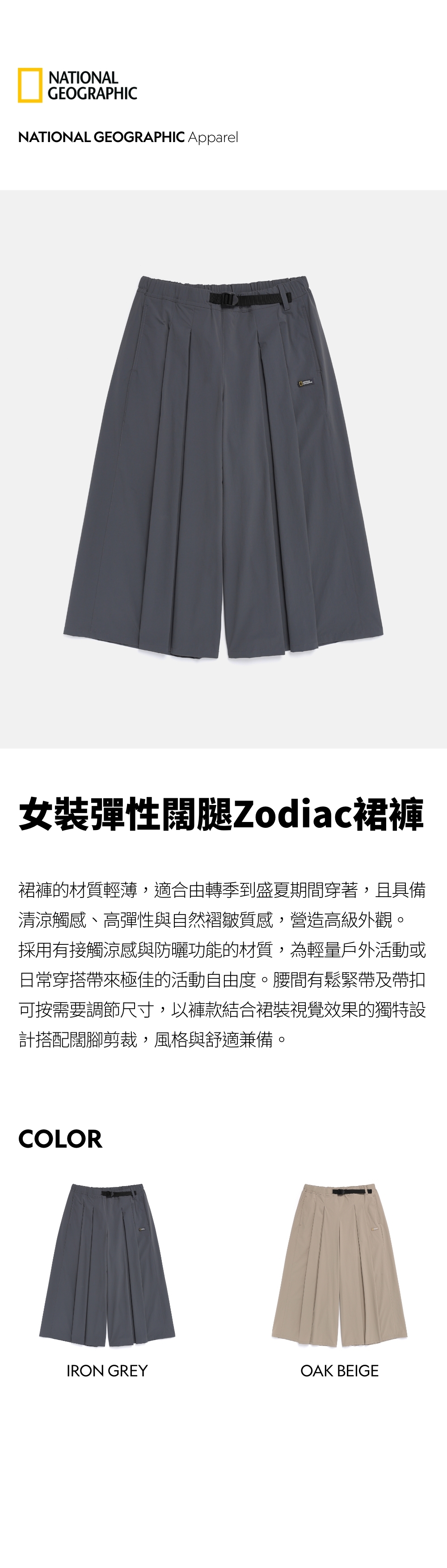 裙褲的材質輕薄,適合由轉季到盛夏期間穿著,且具備清涼觸感、高彈性與自然褶皺質感,營造高級外觀。採用有接觸涼感與防曬功能的材質,為輕量戶外活動或日常穿搭帶來極佳的活動自由度。腰間有鬆緊帶及帶扣可按需要調節尺寸,以褲款結合裙裝視覺效果的獨特設計搭配闊腳剪裁,風格與舒適兼備。