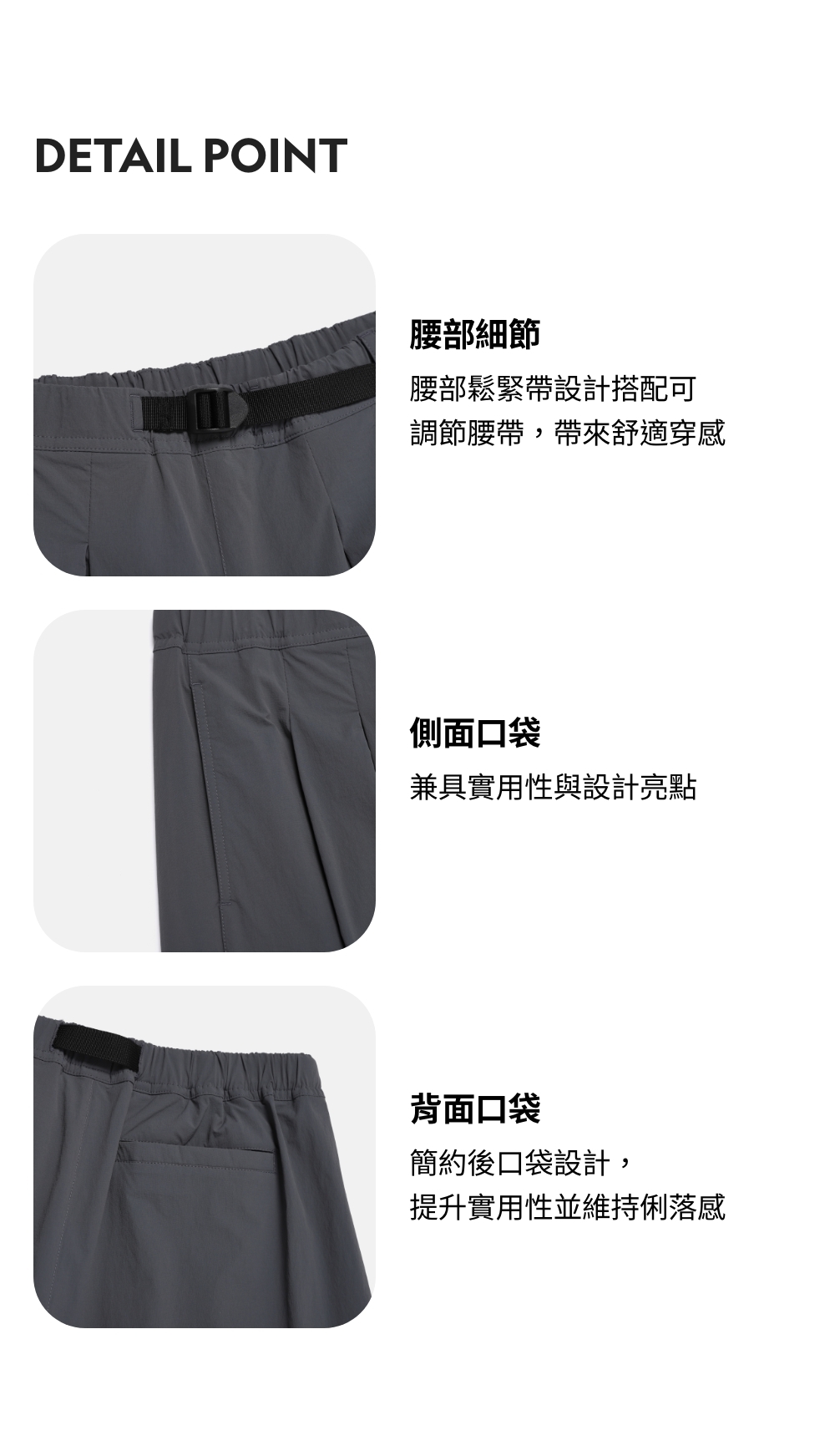 腰部鬆緊帶設計搭配可調節腰帶,帶來舒適穿感