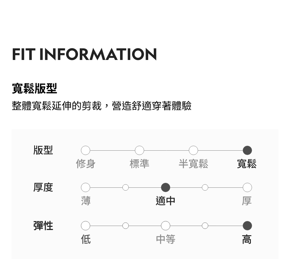寬鬆版型 / 厚度:適中 / 彈性:高