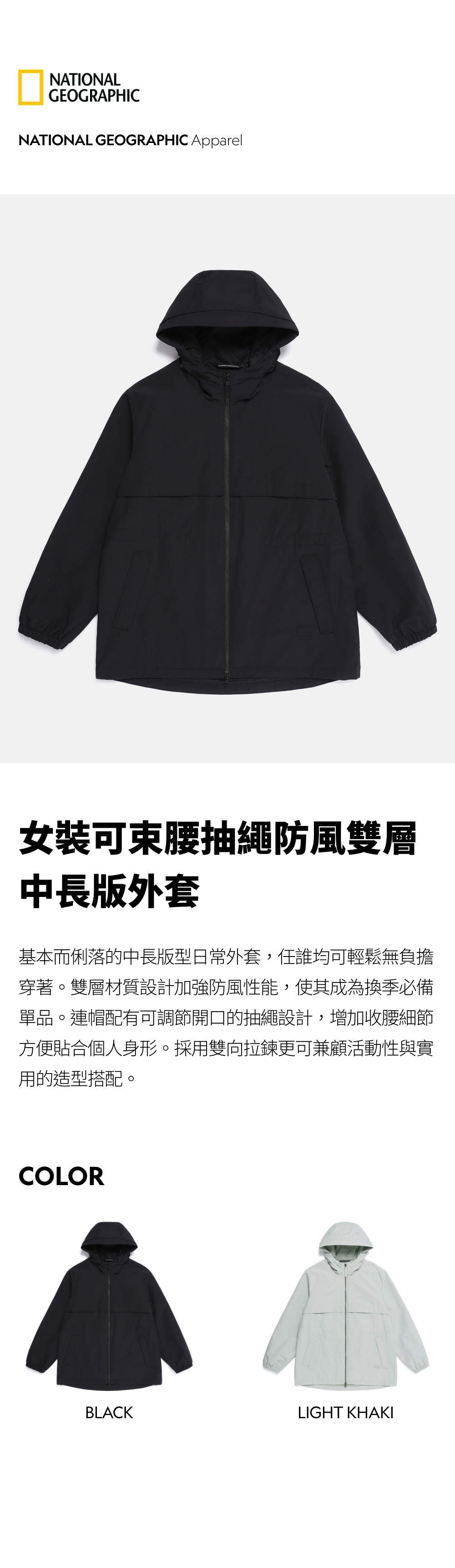 - 基本而俐落的中長版型日常外套,任誰均可輕鬆無負擔穿著。雙層材質設計加強防風性能,使其成為換季必備單品。連帽配有可調節開口的抽繩設計,增加收腰細節方便貼合個人身形。採用雙向拉鍊更可兼顧活動性與實用的造型搭配。