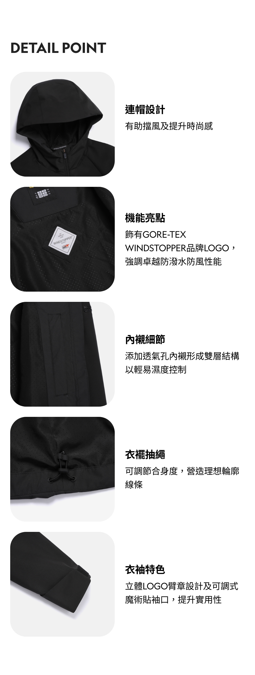 -機能亮點:飾有GORE-TEX WINDSTOPPER品牌LOGO,強調卓越防潑水防風性能