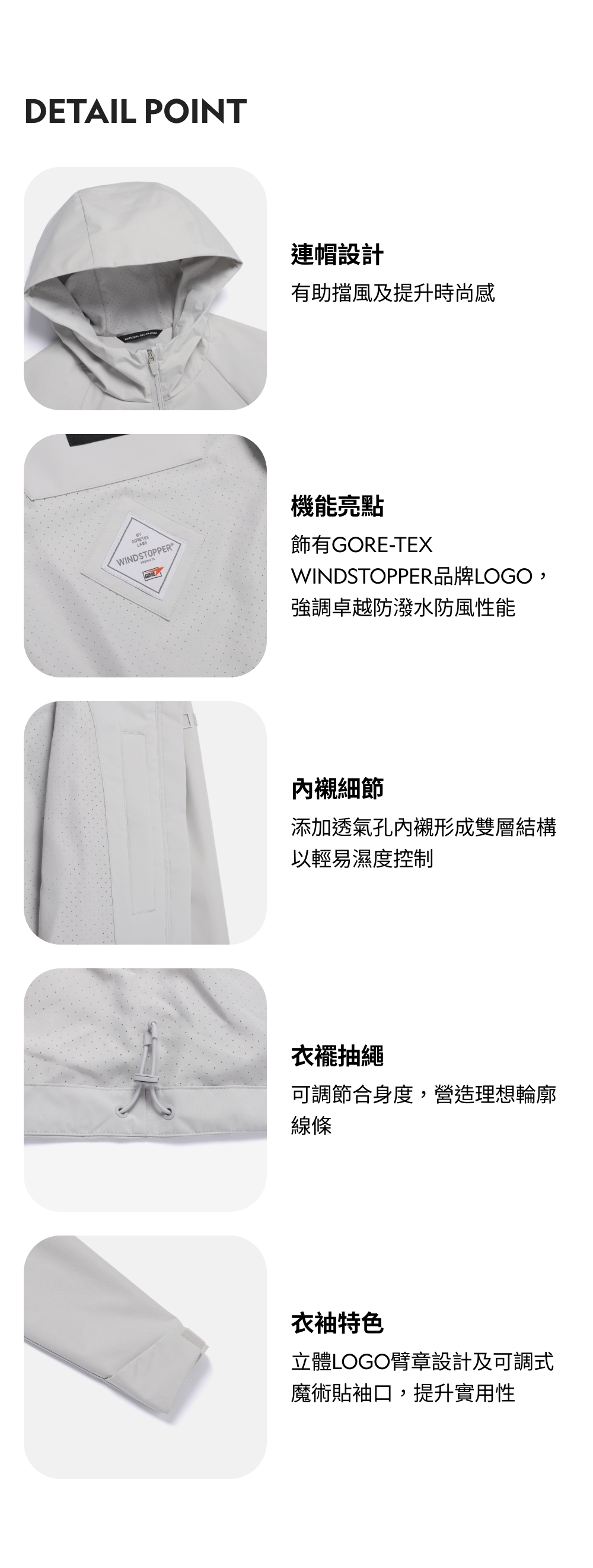 -機能亮點:飾有GORE-TEX WINDSTOPPER品牌LOGO,強調卓越防潑水防風性能
