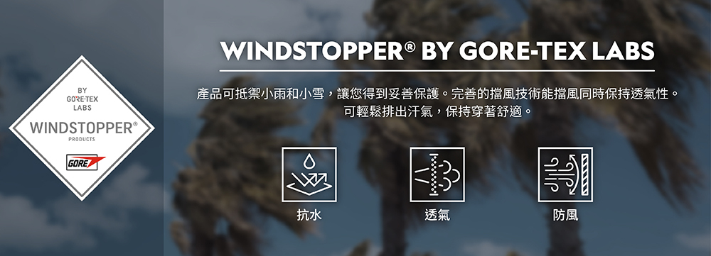 - 採用WINDSTOPPER雙層材質,具備抗水、防風及卓越透氣功能