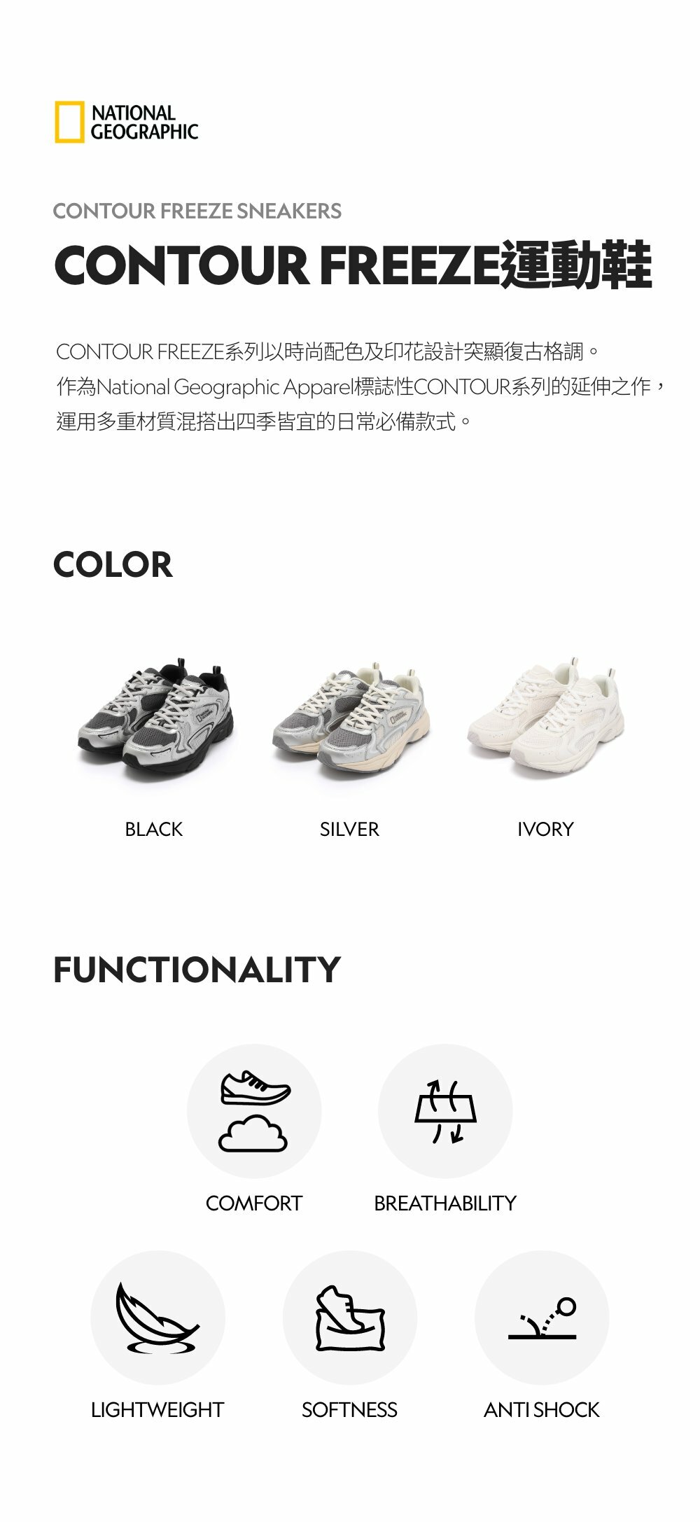 作為National Geographic Apparel標誌性CONTOUR系列的延伸之作,運用多重材質混搭出四季皆宜的日常必備款式。