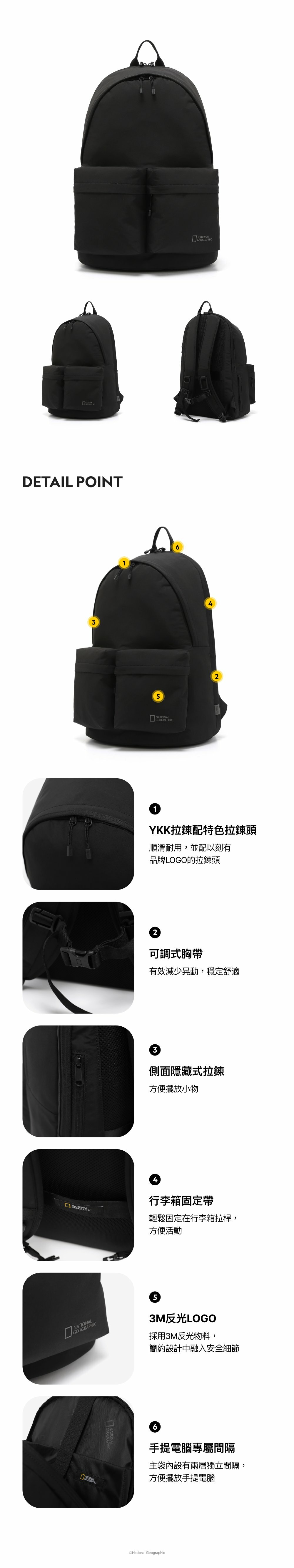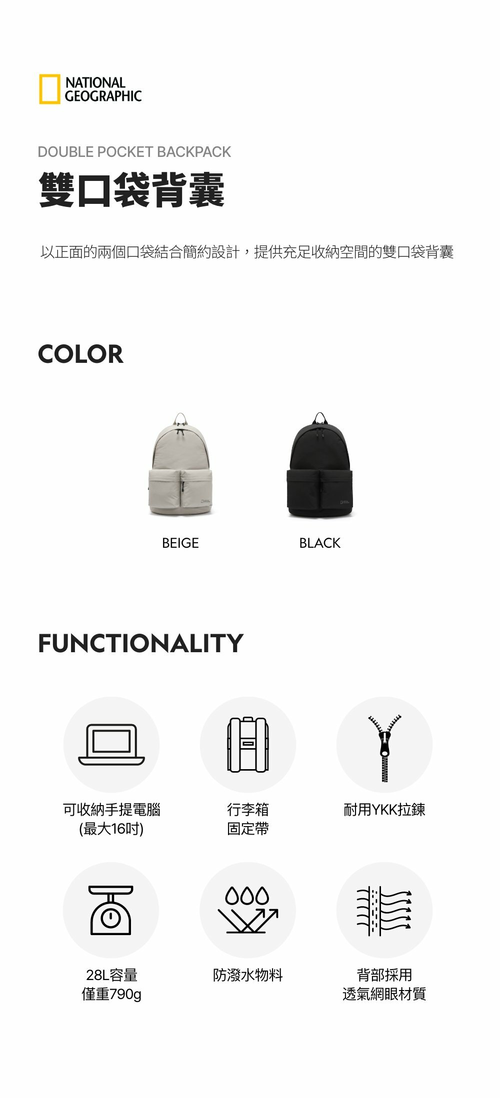 - 以正面的兩個口袋結合簡約設計,提供充足收納空間的雙口袋背囊