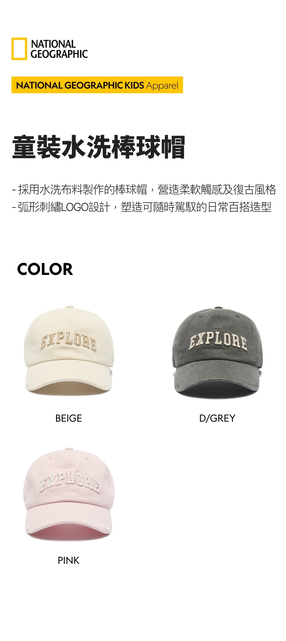 - 採用水洗布料製作的棒球帽,營造柔軟觸感及復古風格