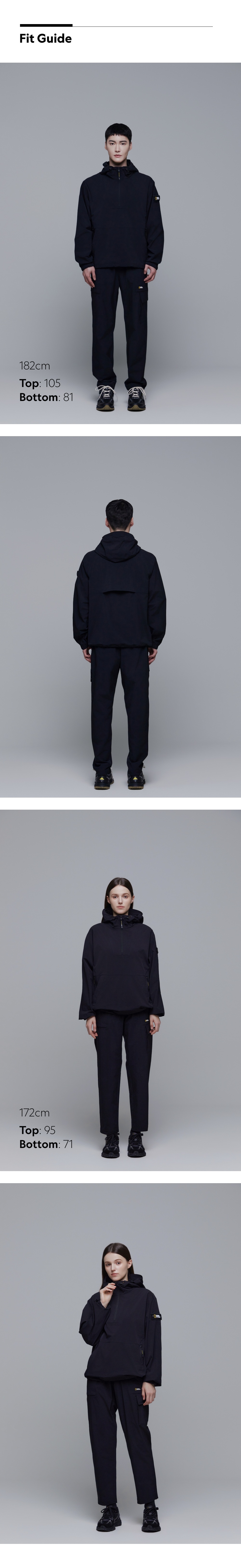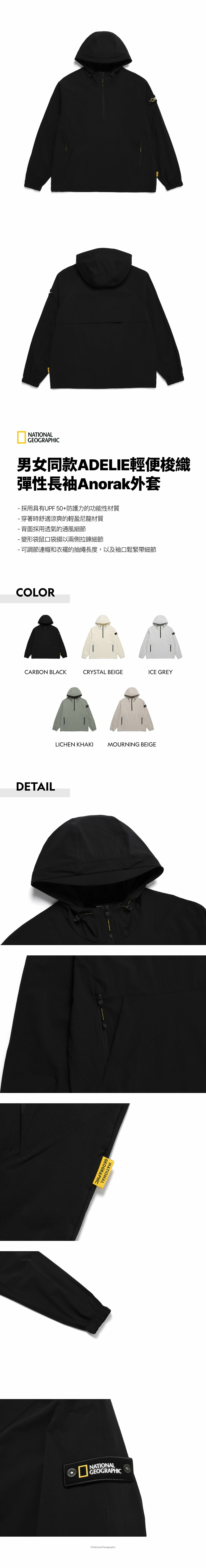 - 可調節連帽和衣襬的抽繩長度,以及袖口鬆緊帶細節